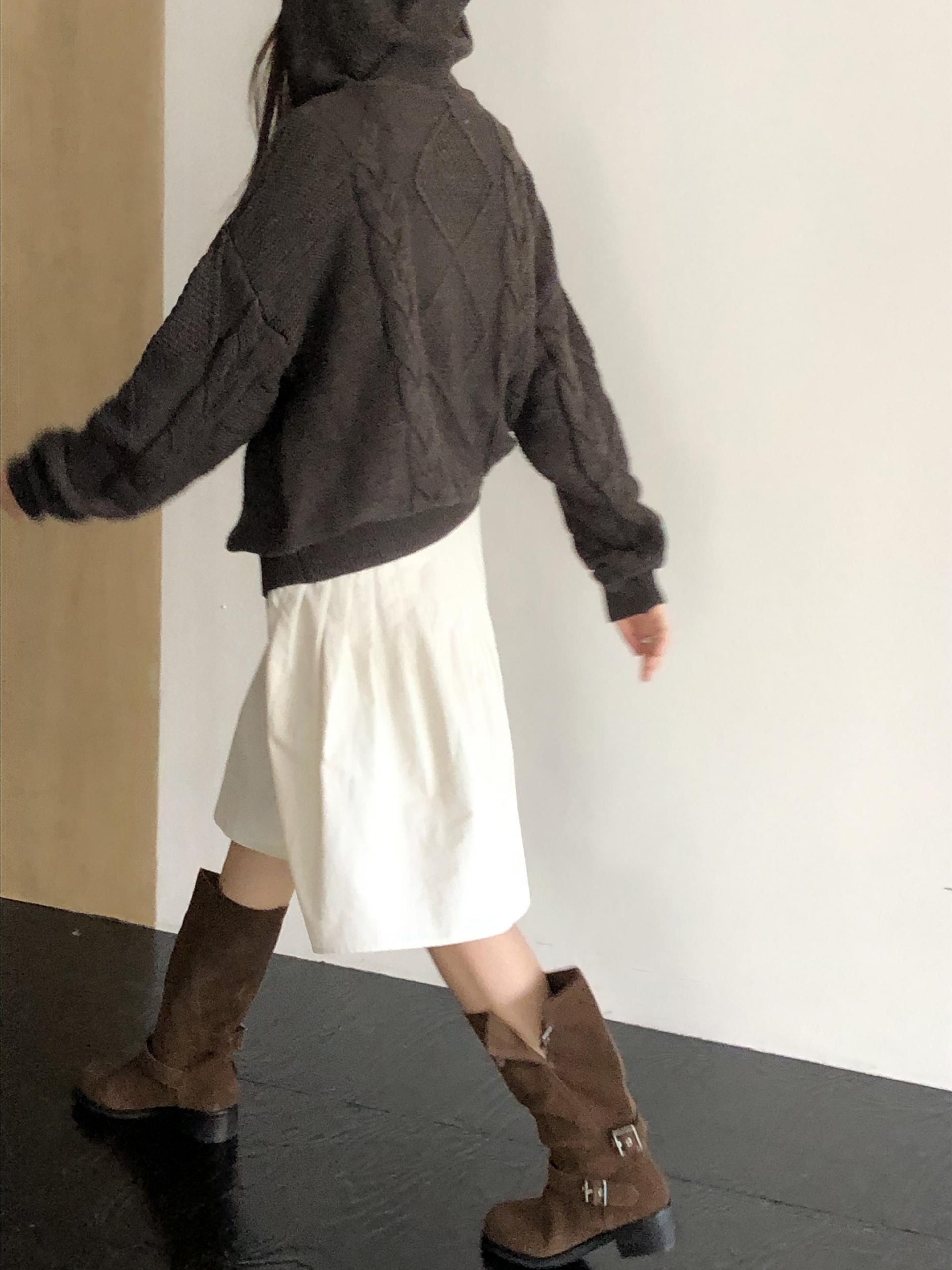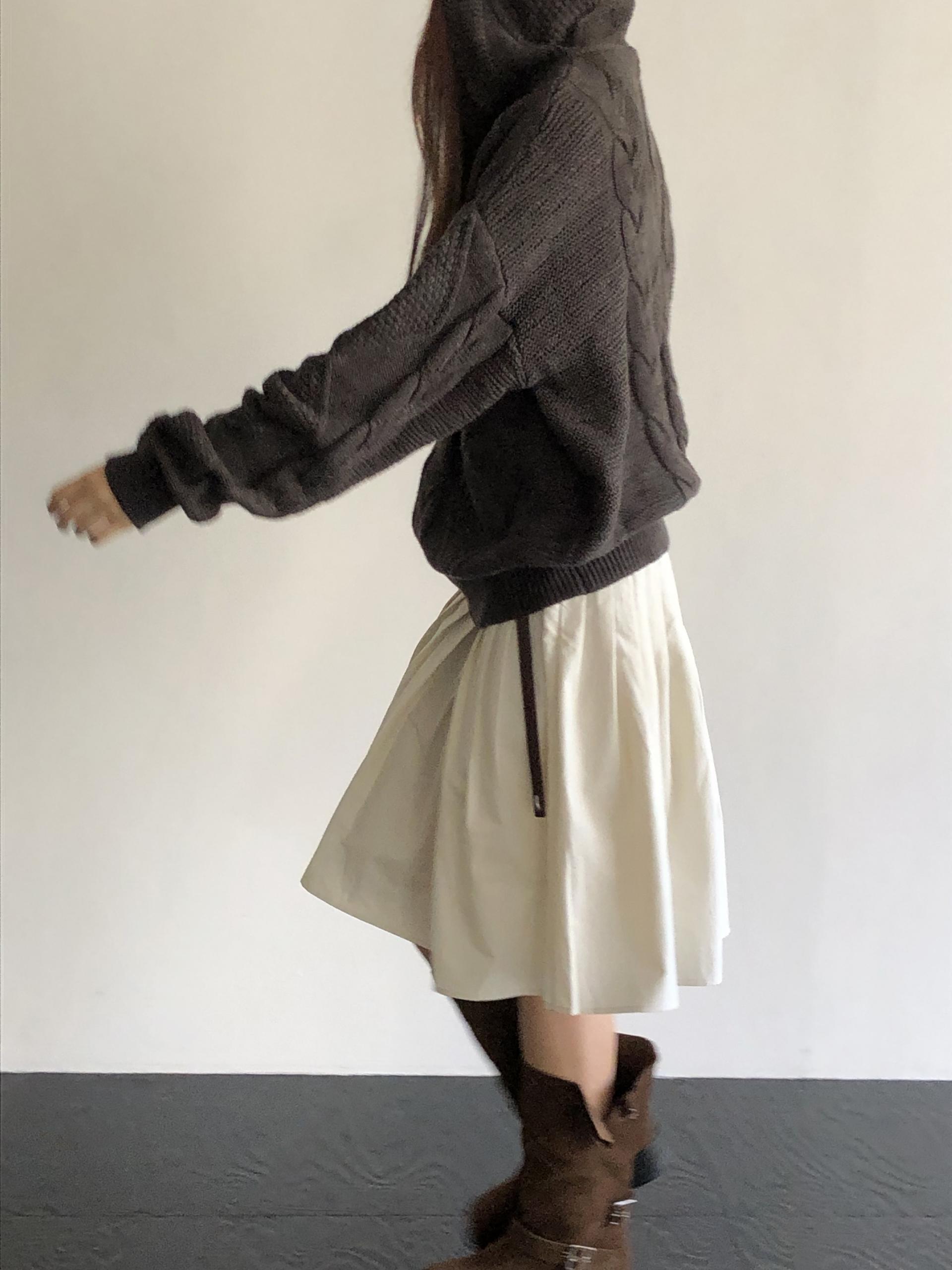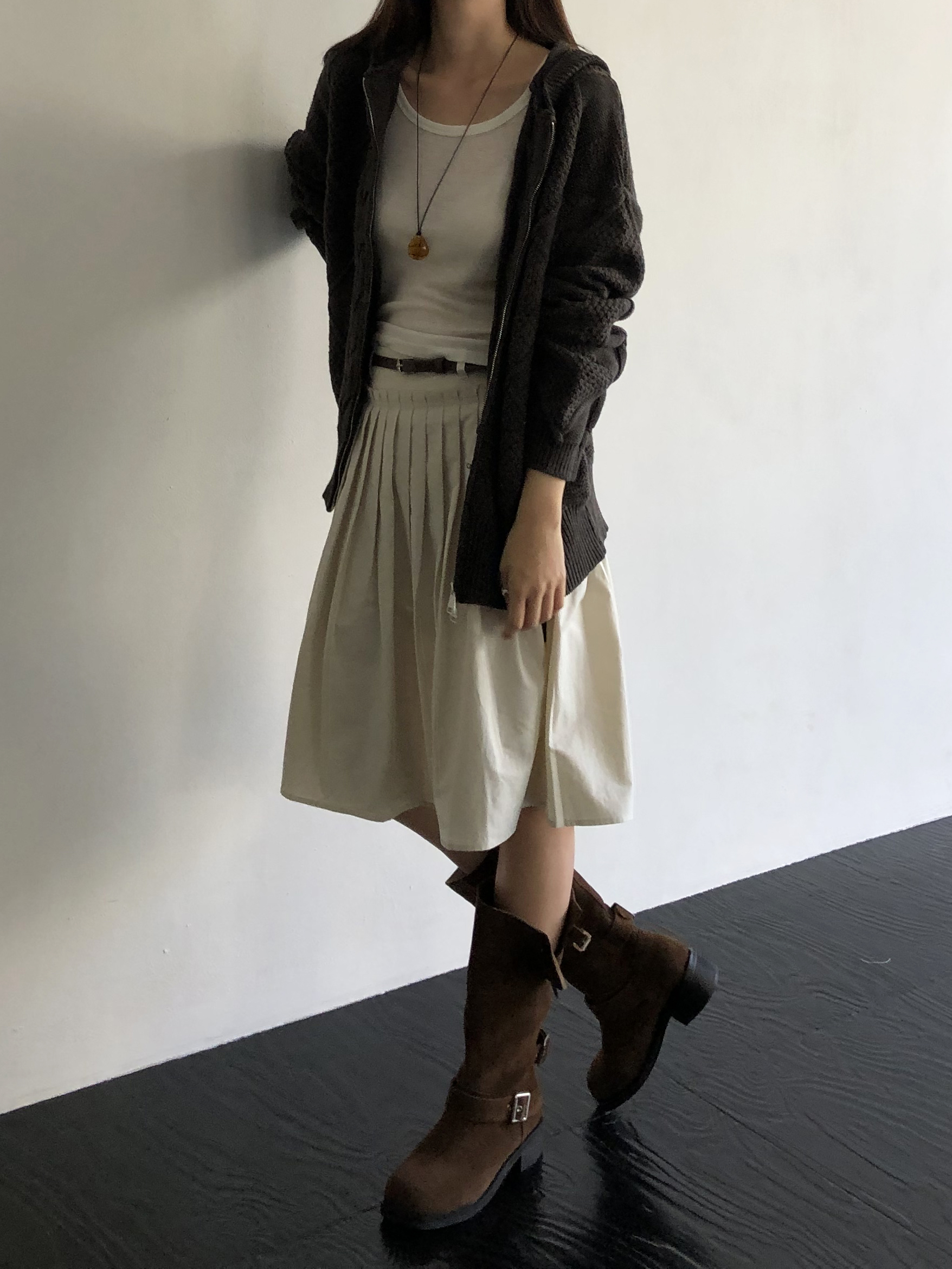 무릎을 살짝 덮는 미디 기장, 촘촘하게 잡힌 플리츠 주름으로 벙벙하게 귀여운 실루엣입니다. 벙벙한 실루엣이 부담스러울 땐 길거나 오버한 탑을 선택해 살짝 눌러주면 된답니다 ㅎㅎ 벨트 고리가 있어 벨트 포인트 주기에도 좋아요.