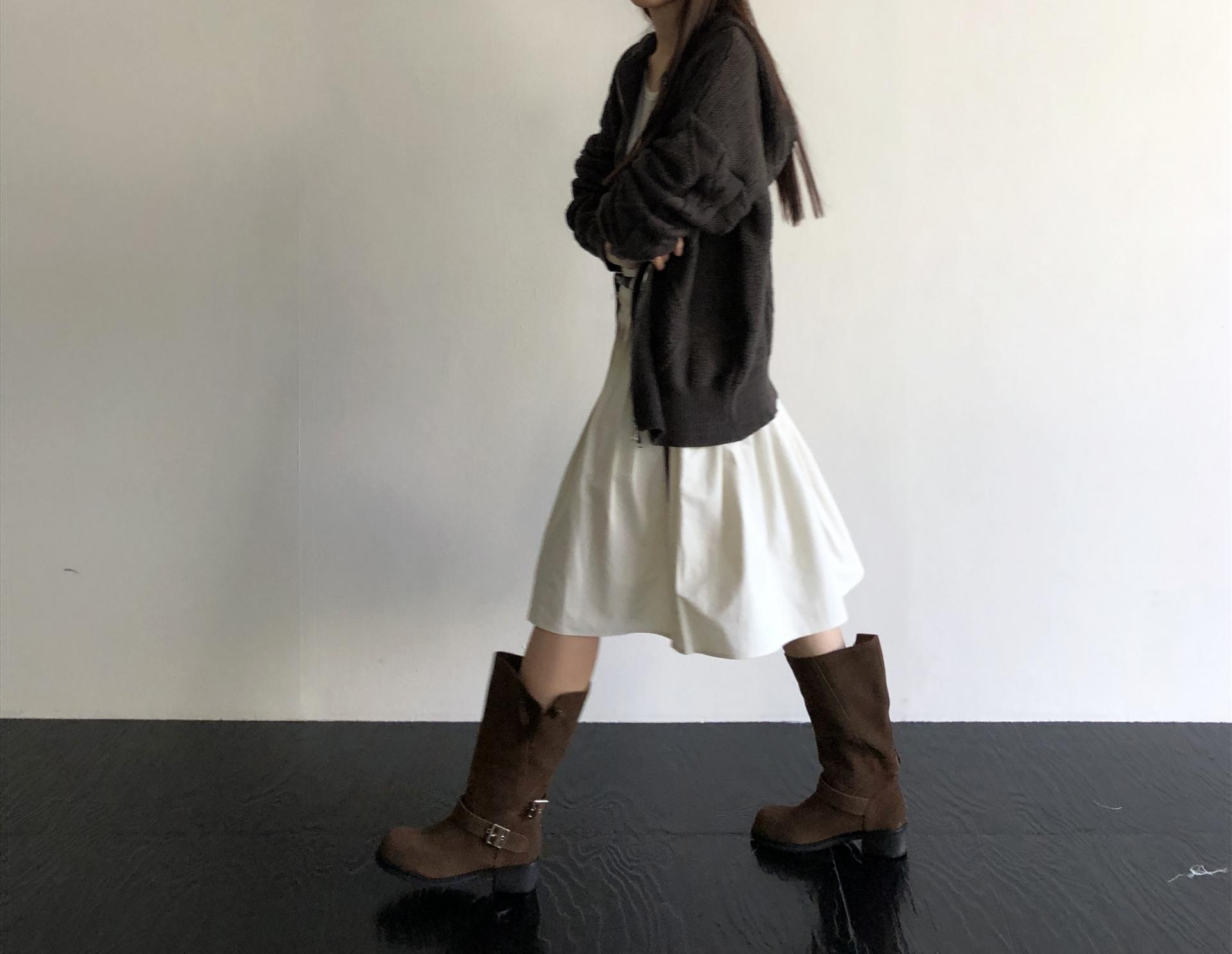 베이직한 니트에 미디 스커트 + 플랫의 빈티지하면서 데일리한 스타일링부터 레더나 블루종 아우터 + 부츠같은 꾸안꾸 스타일링하기 좋은 스커트예요. 다양하게 활용하기 좋아 하나쯤 소장하기를 추천드리는 스커트입니다.