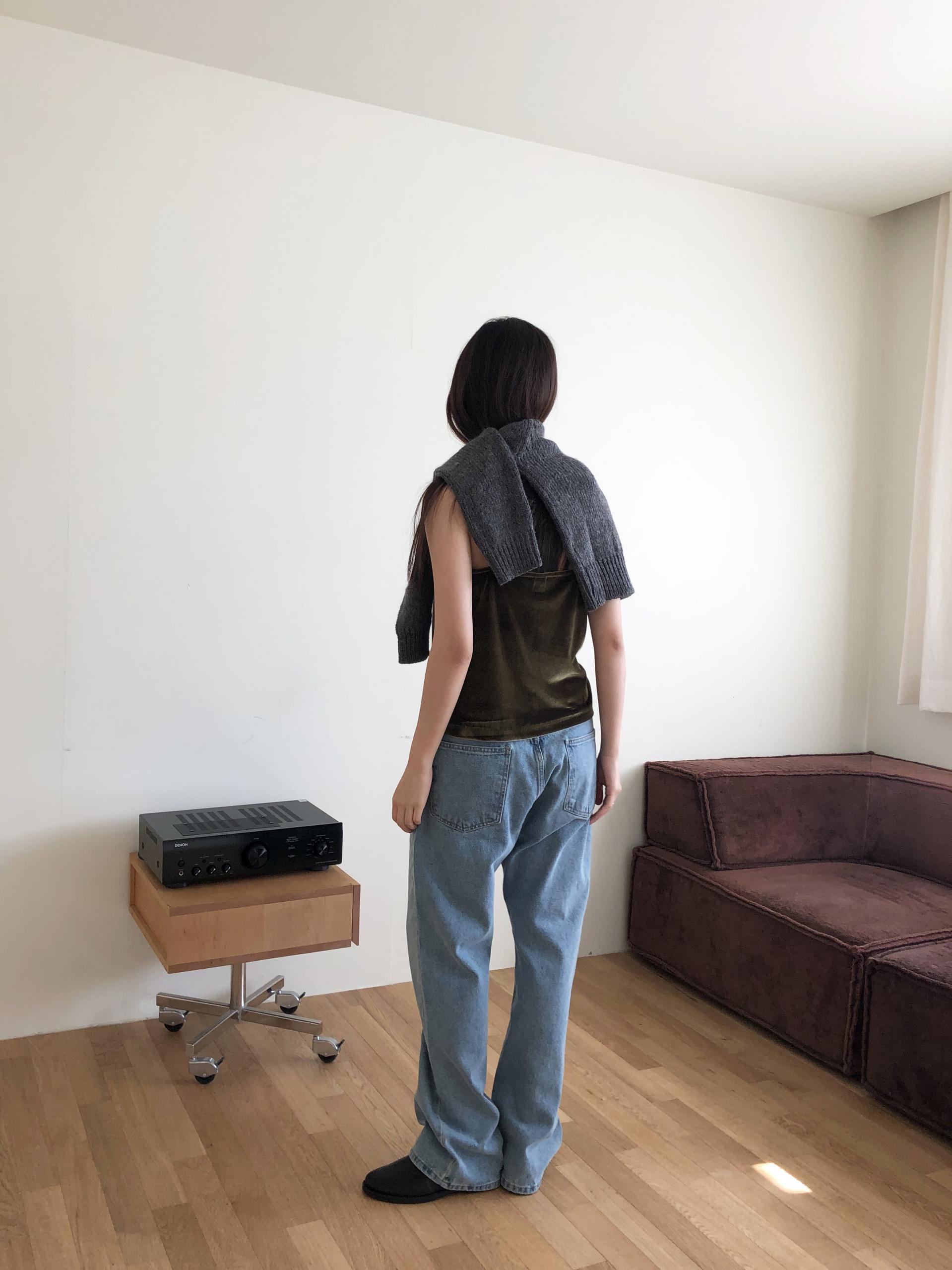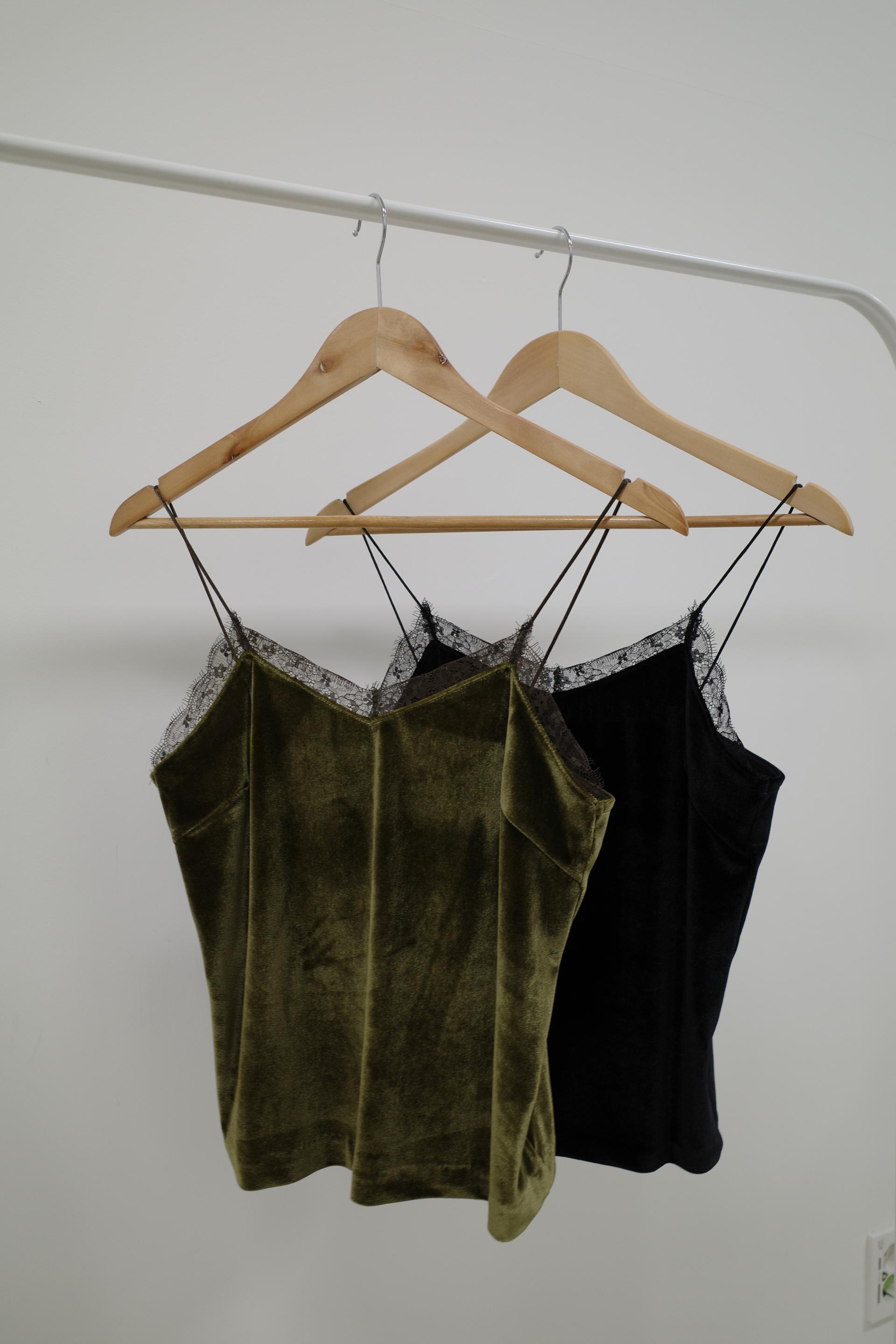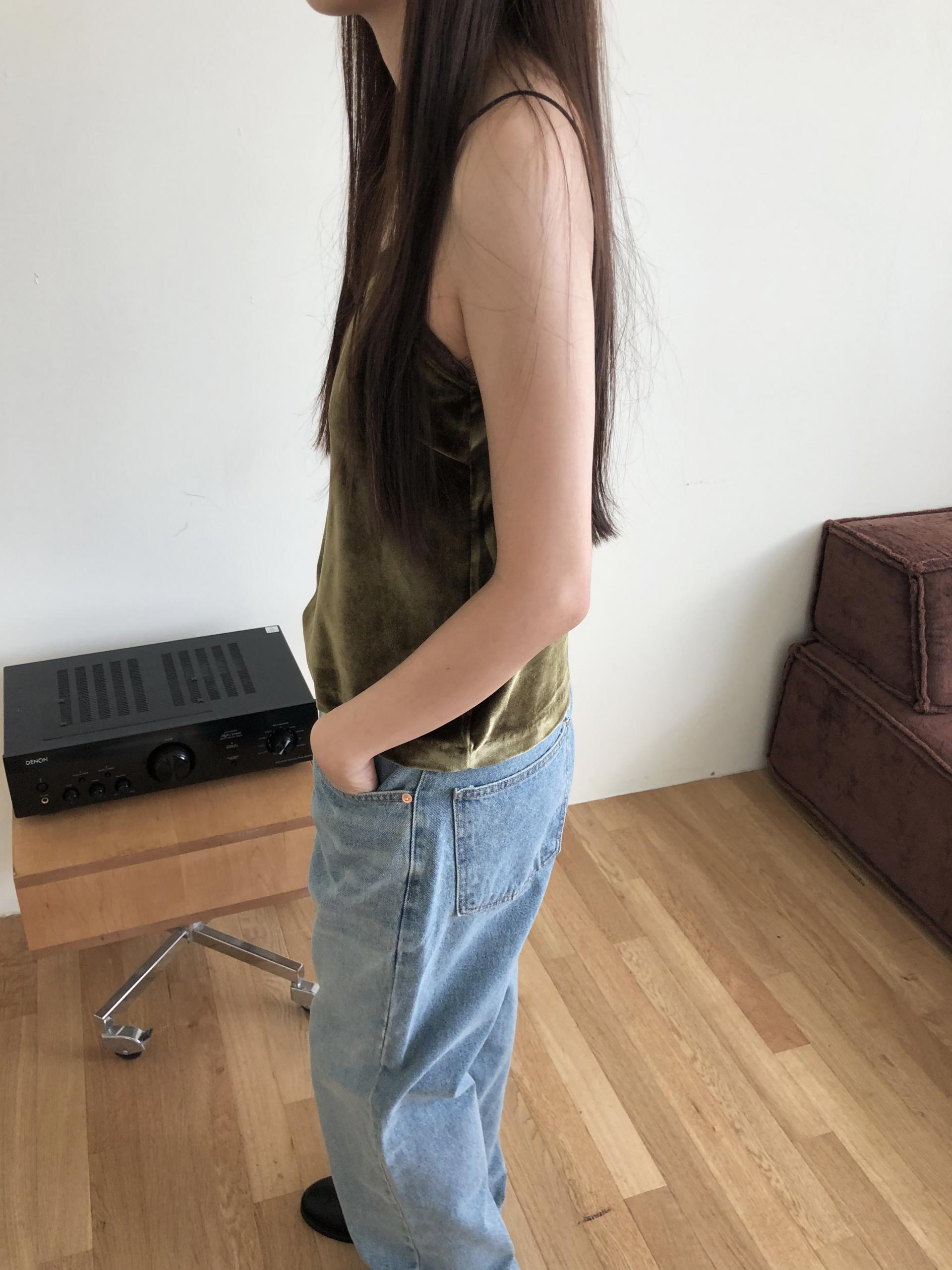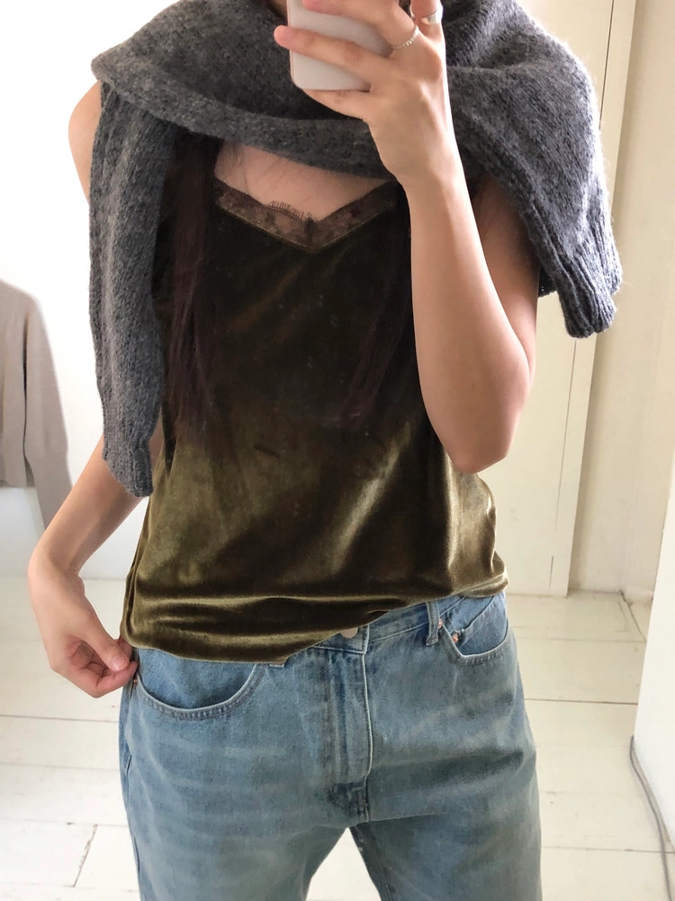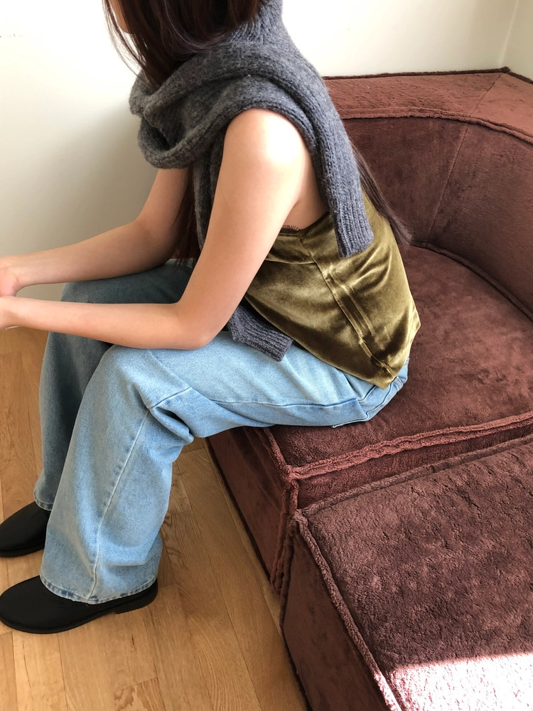 은은한 광택감이 느껴지는 벨벳 소재의 슬리브리스 탑입니다.