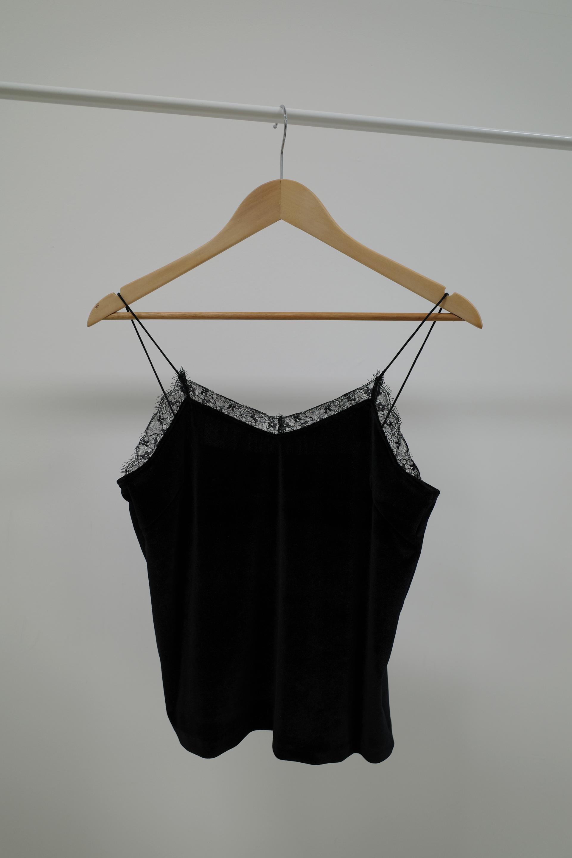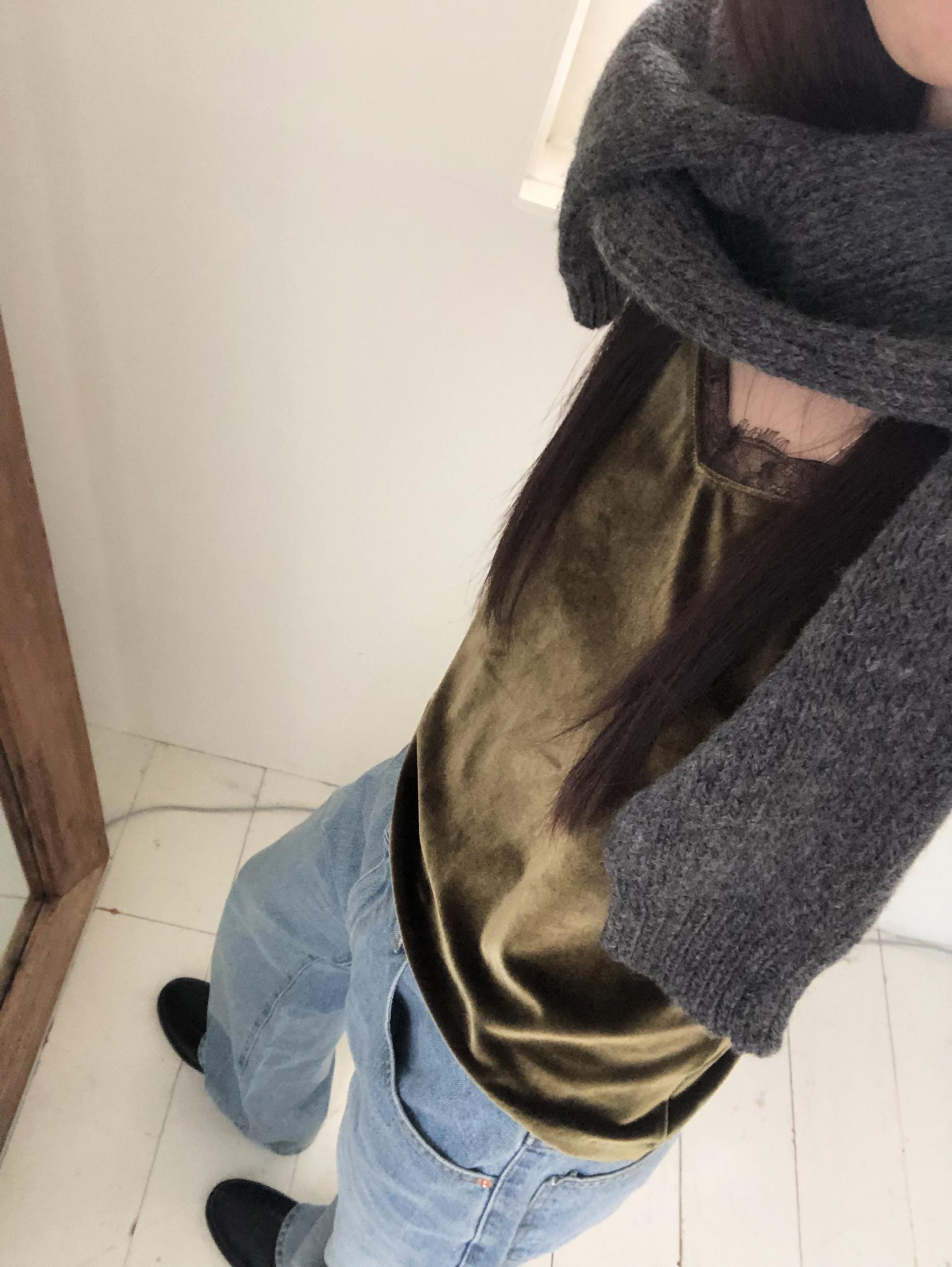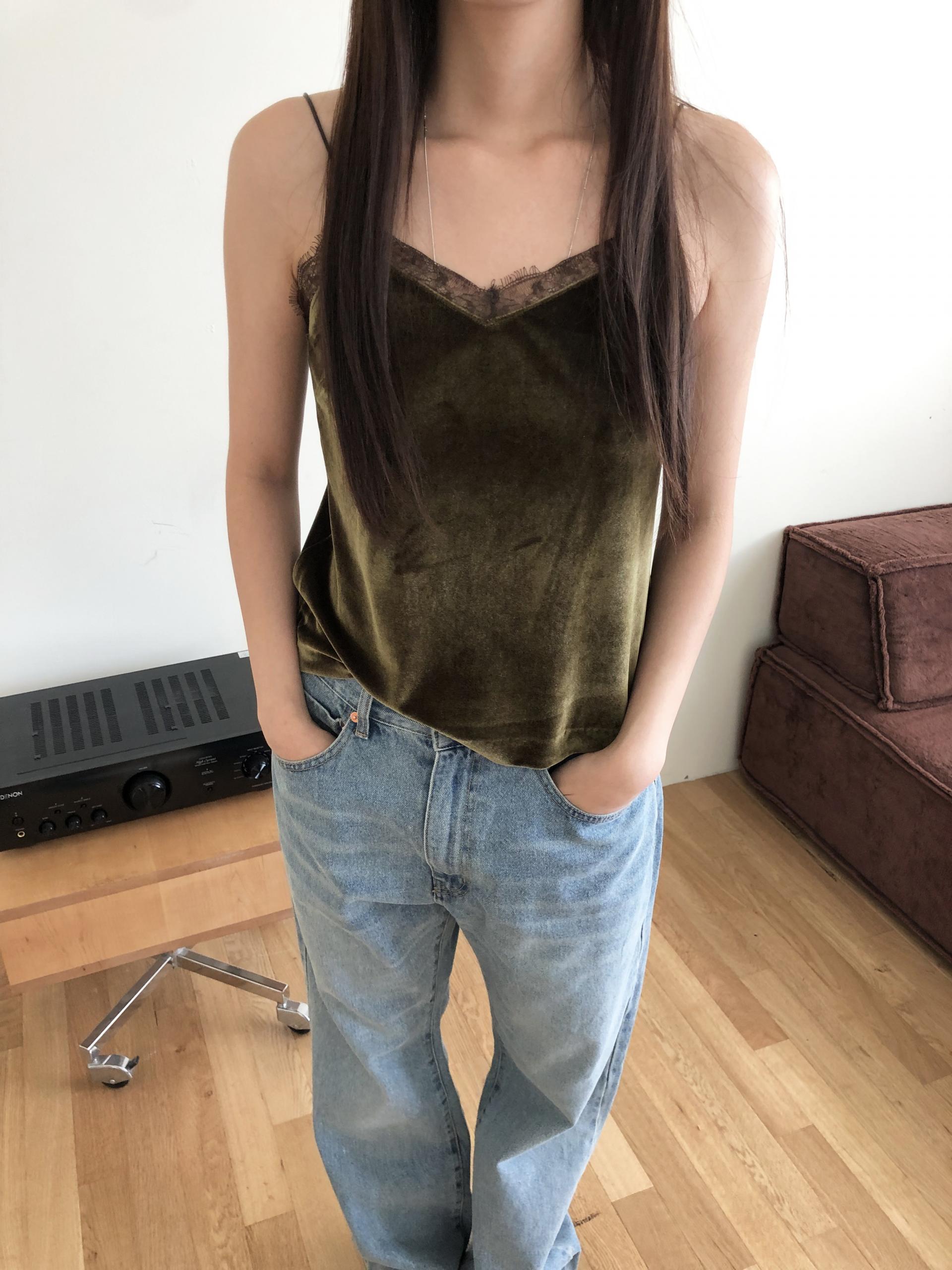은은한 광택감이 느껴지는 벨벳 소재의 슬리브리스 탑입니다.