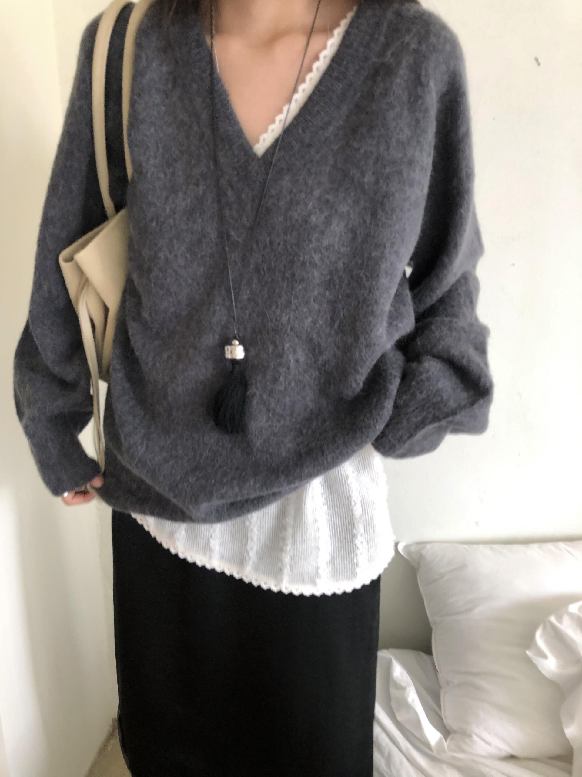브이넥이든, 라운드넥이든 과하지 않게 살짝살짝 보이도록 연출되어 은근하게 포인트주기 좋습니다.