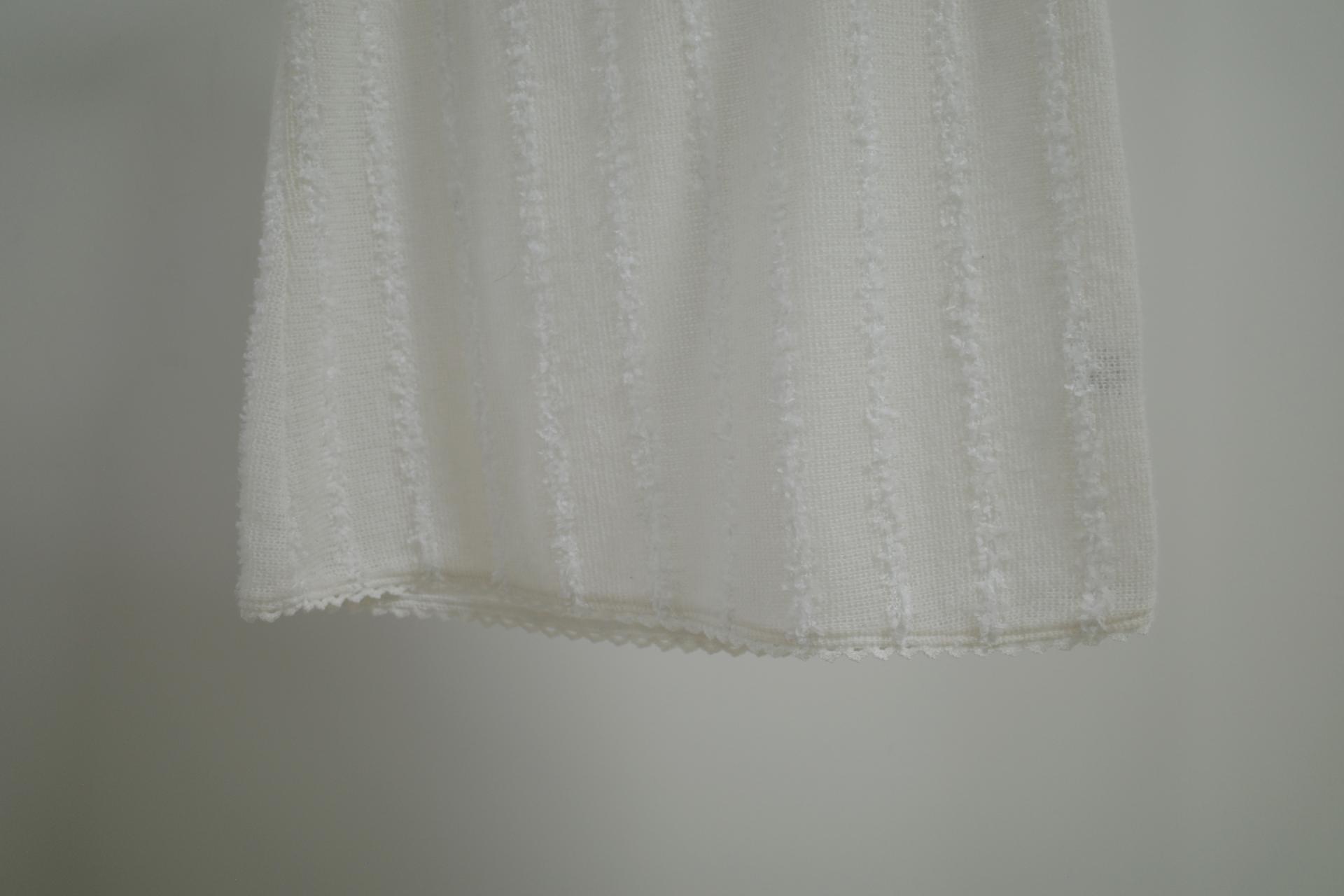 가을-겨울 원단이지만 살이 은근히 비치는 메쉬 소재 베이스 위로 세로 라인을 따라 깃털처럼 흩어진 텍스쳐가 입체적인 느낌을 연출합니다.