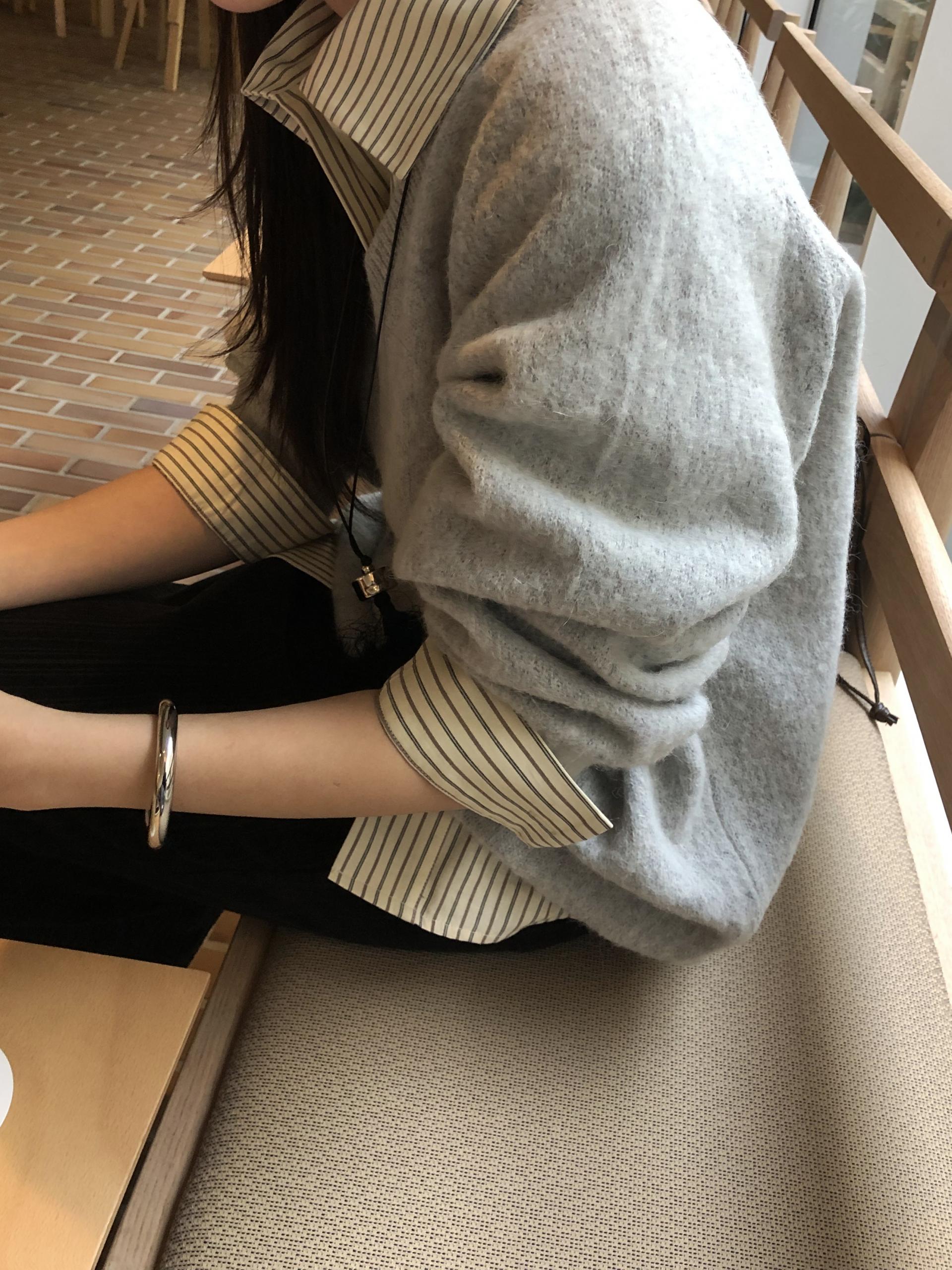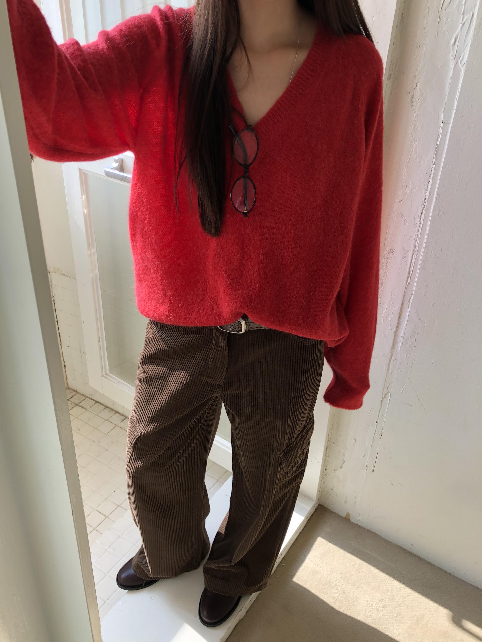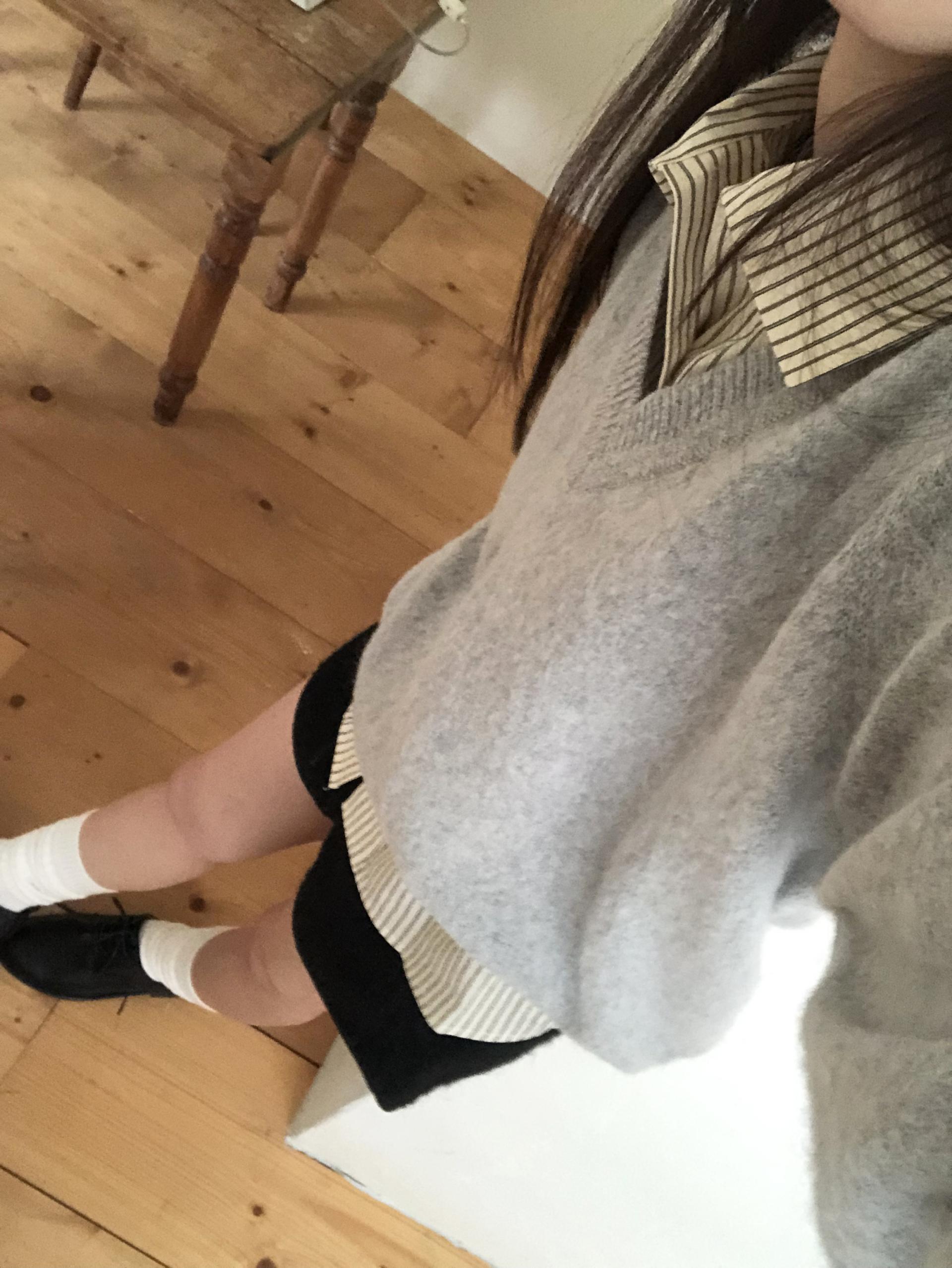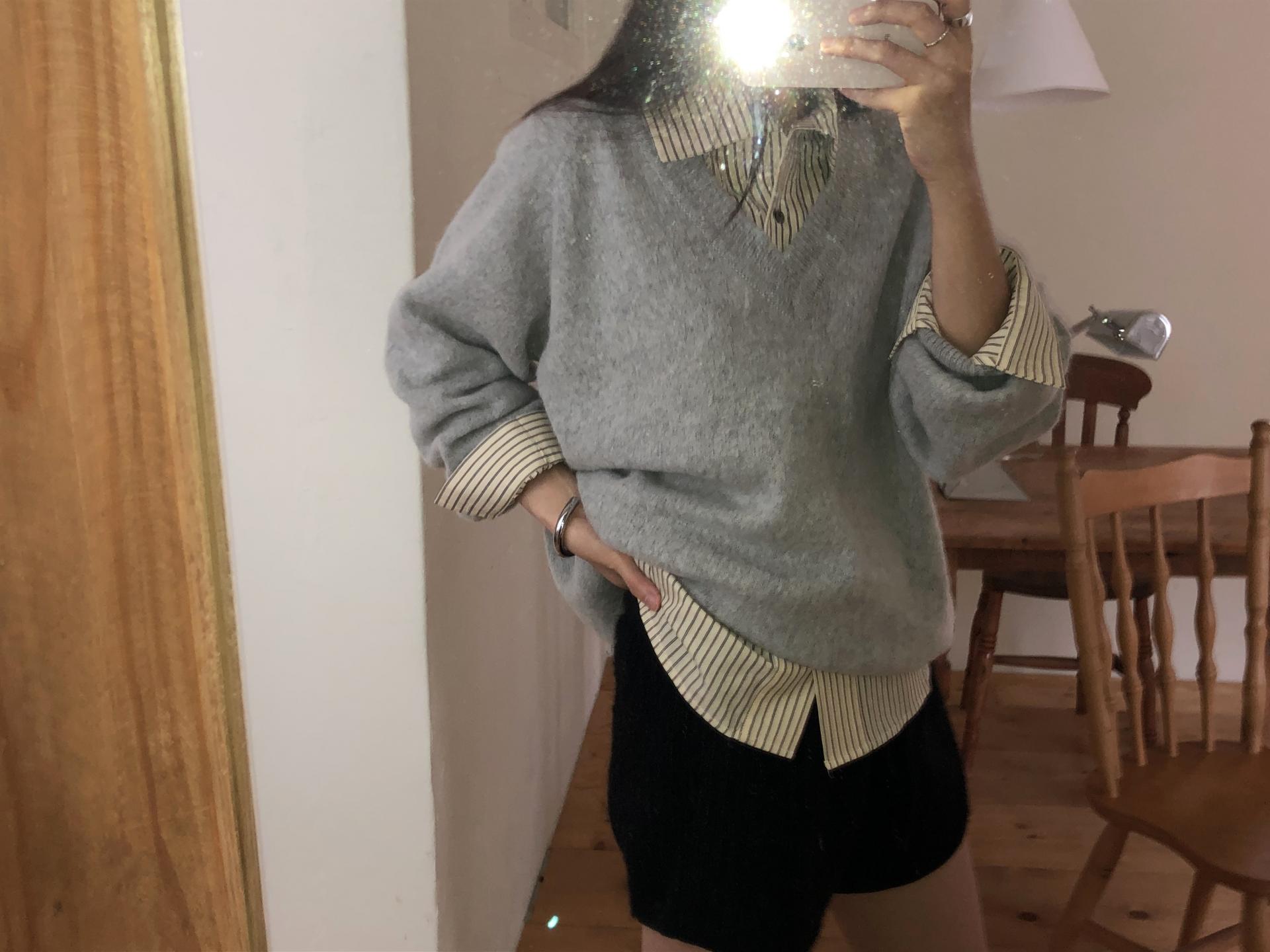 가볍지만 따뜻해요. 브이넥 니트는 특히 셔츠나 티셔츠 등을 레이어링 하는 경우가 많은데, 적당히 도톰한 편이라 레이어드했을 때 거대해지는,, 불상사가 없습니다.