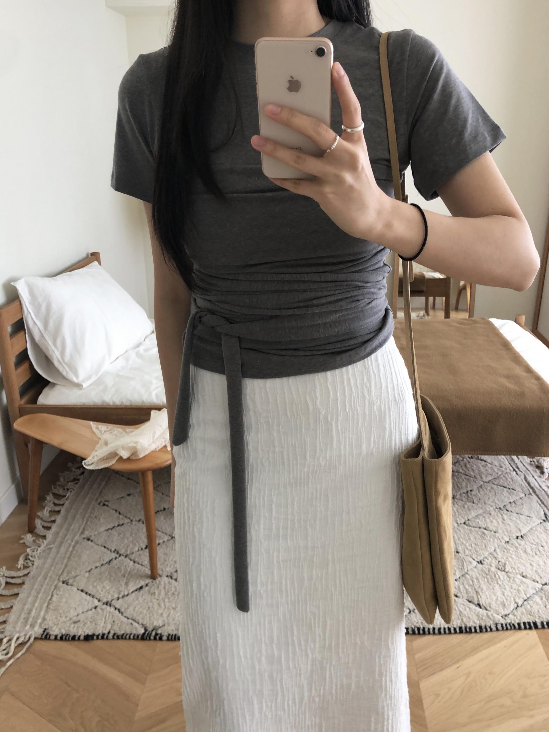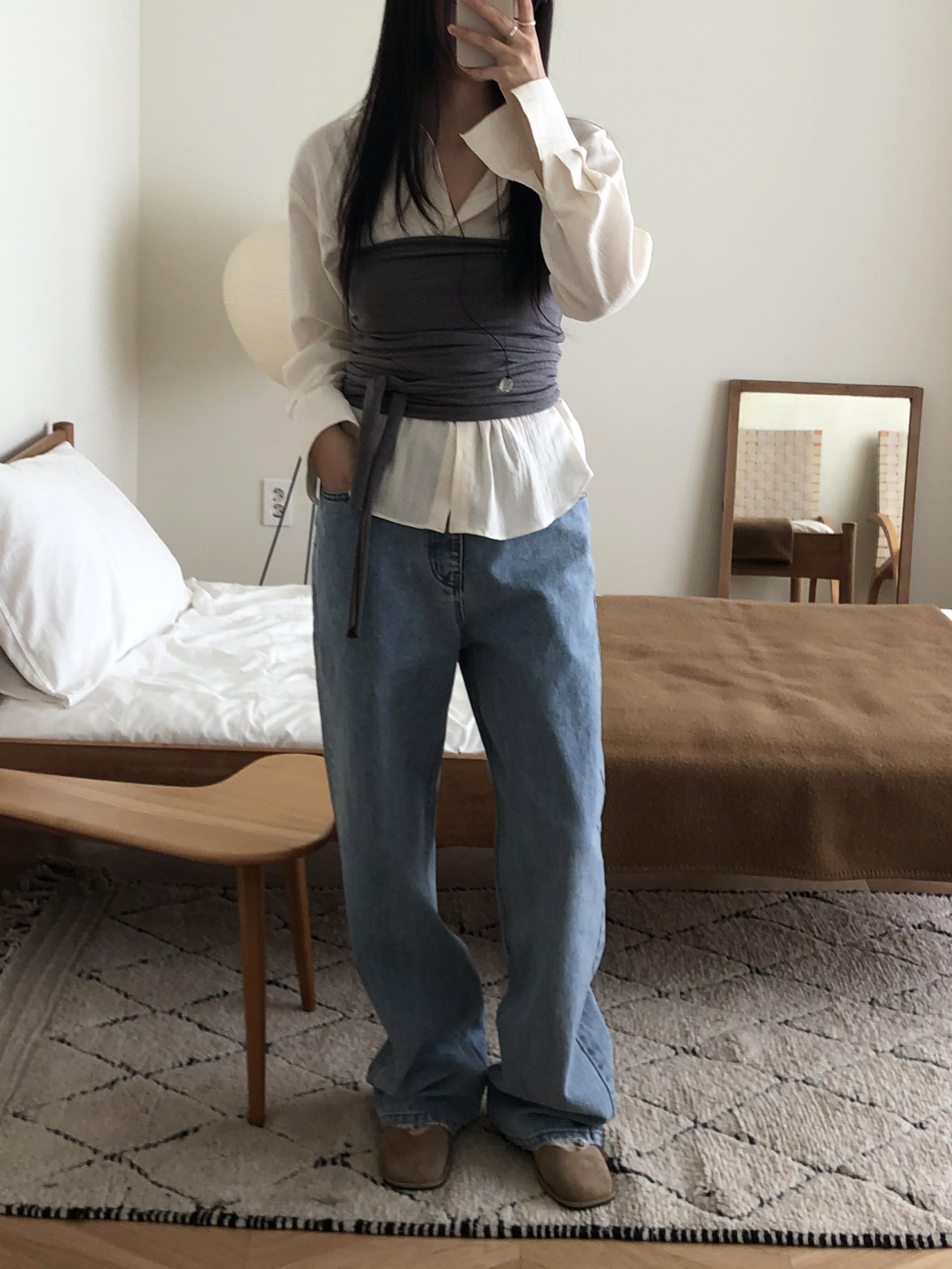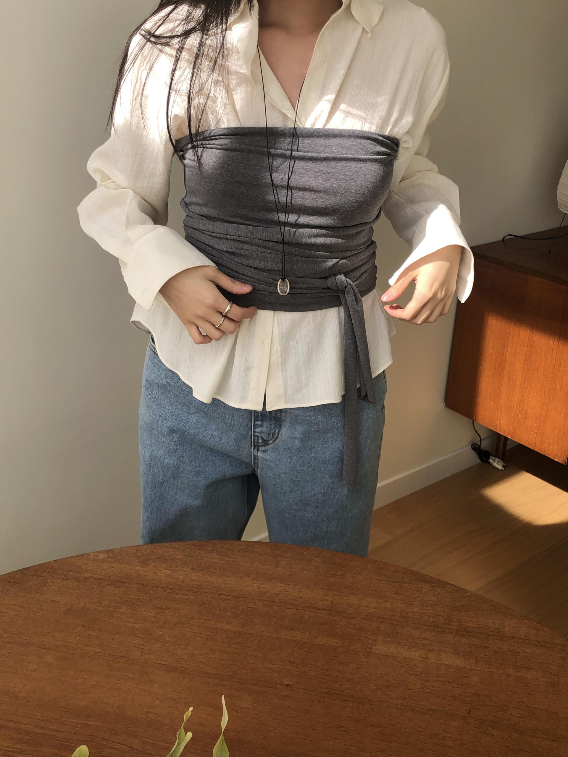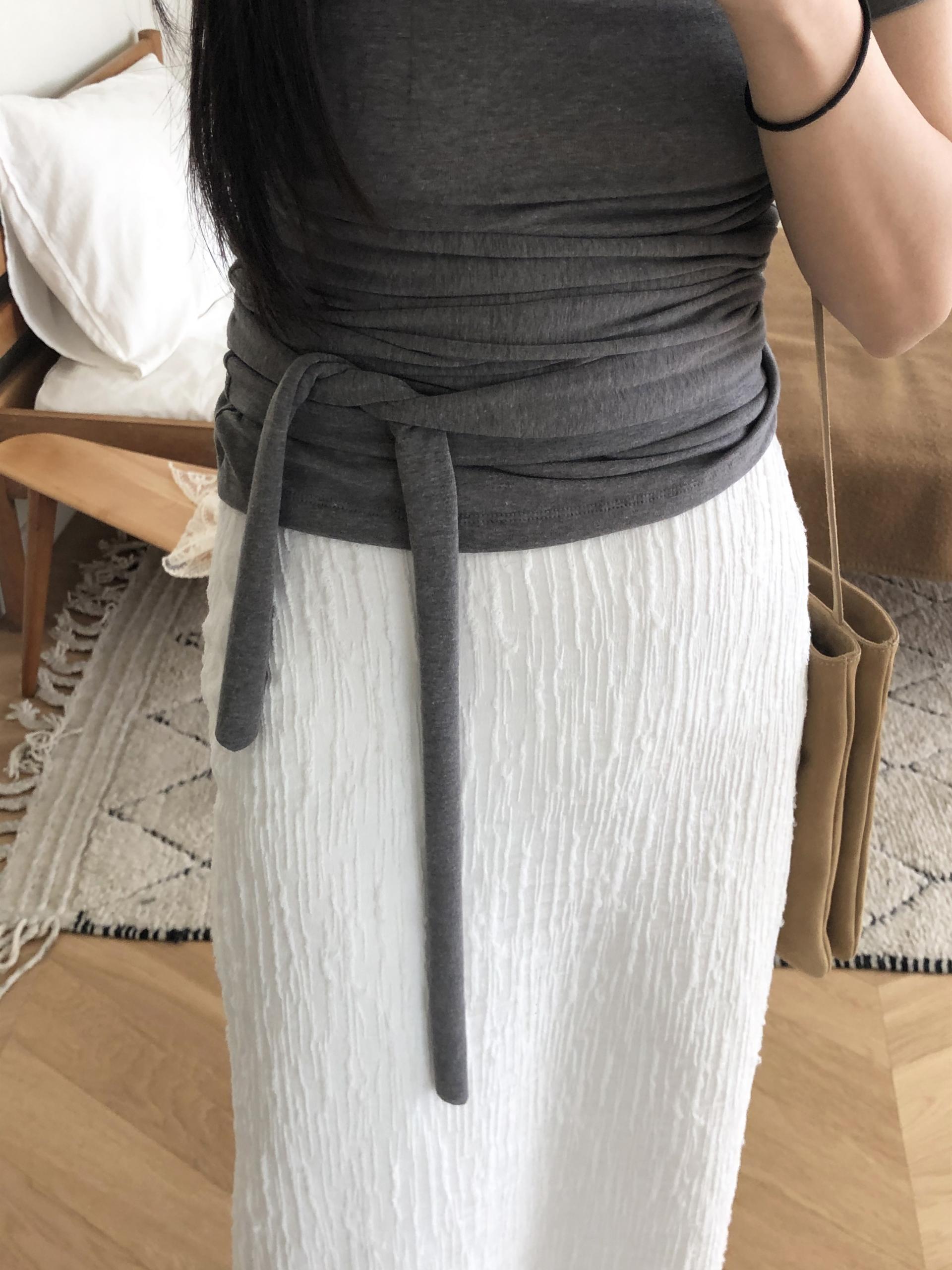 전체적으로 슬림한 핏이지만 신축이 좋아 체형에 크게 구애없이 착용 가능합니다. 튜브탑에 긴 스트랩이 달려있어 취향에 따라 다양하게 연출할 수 있어요. 스트랩을 길게 늘어뜨려 놓을수도 있고, 여러번 감아 짧게 매듭을 지을 수도 있습니다.