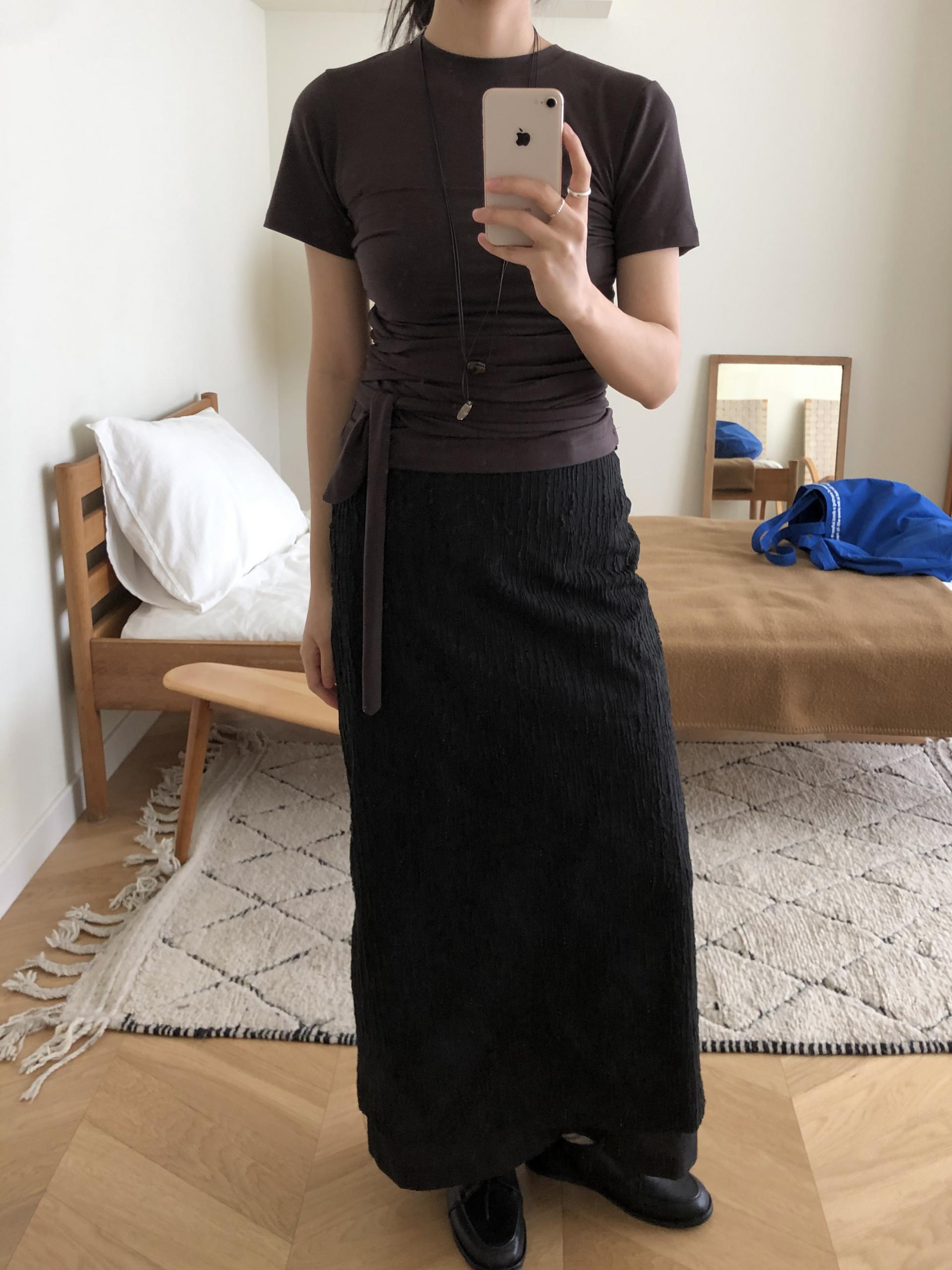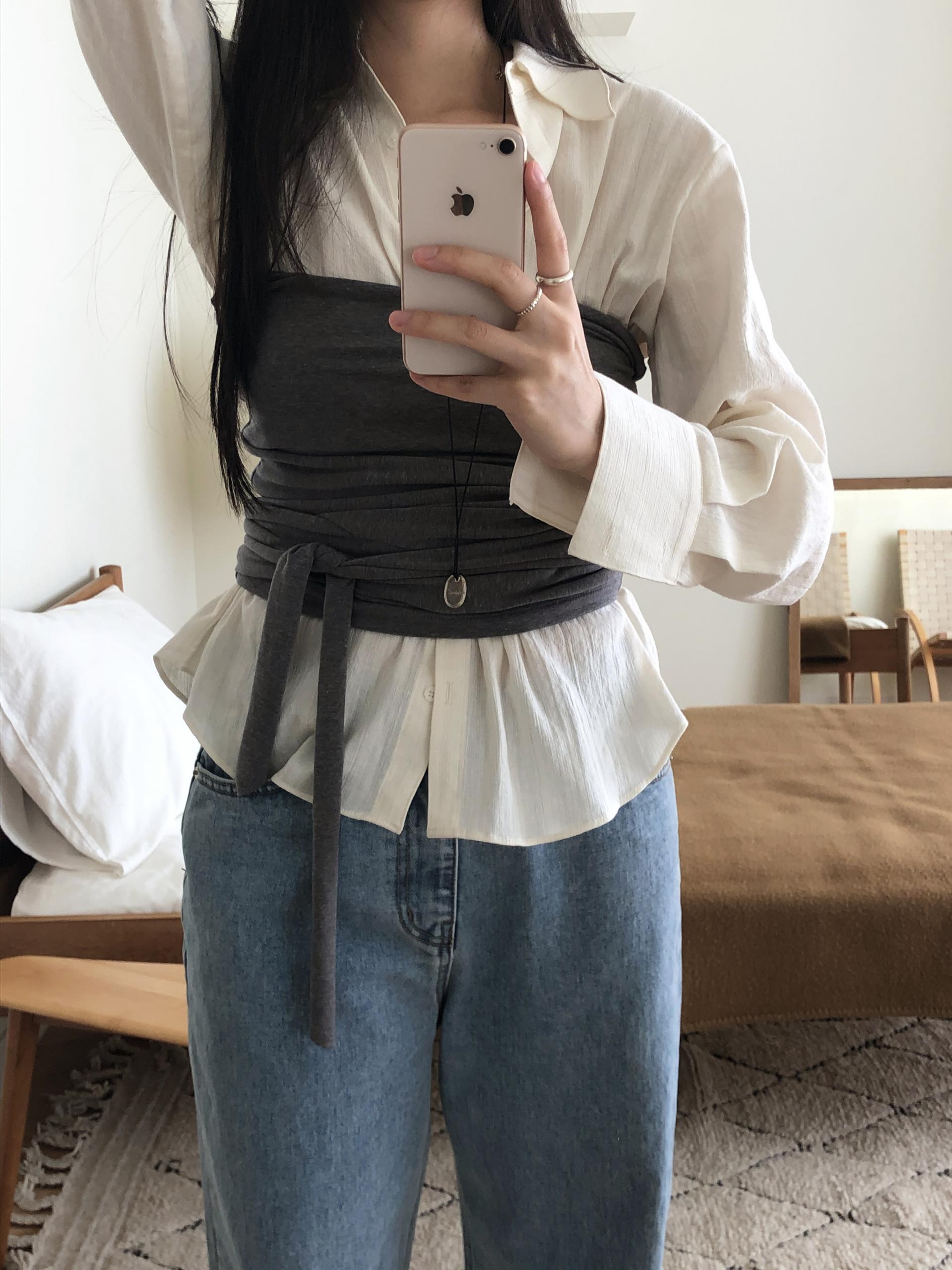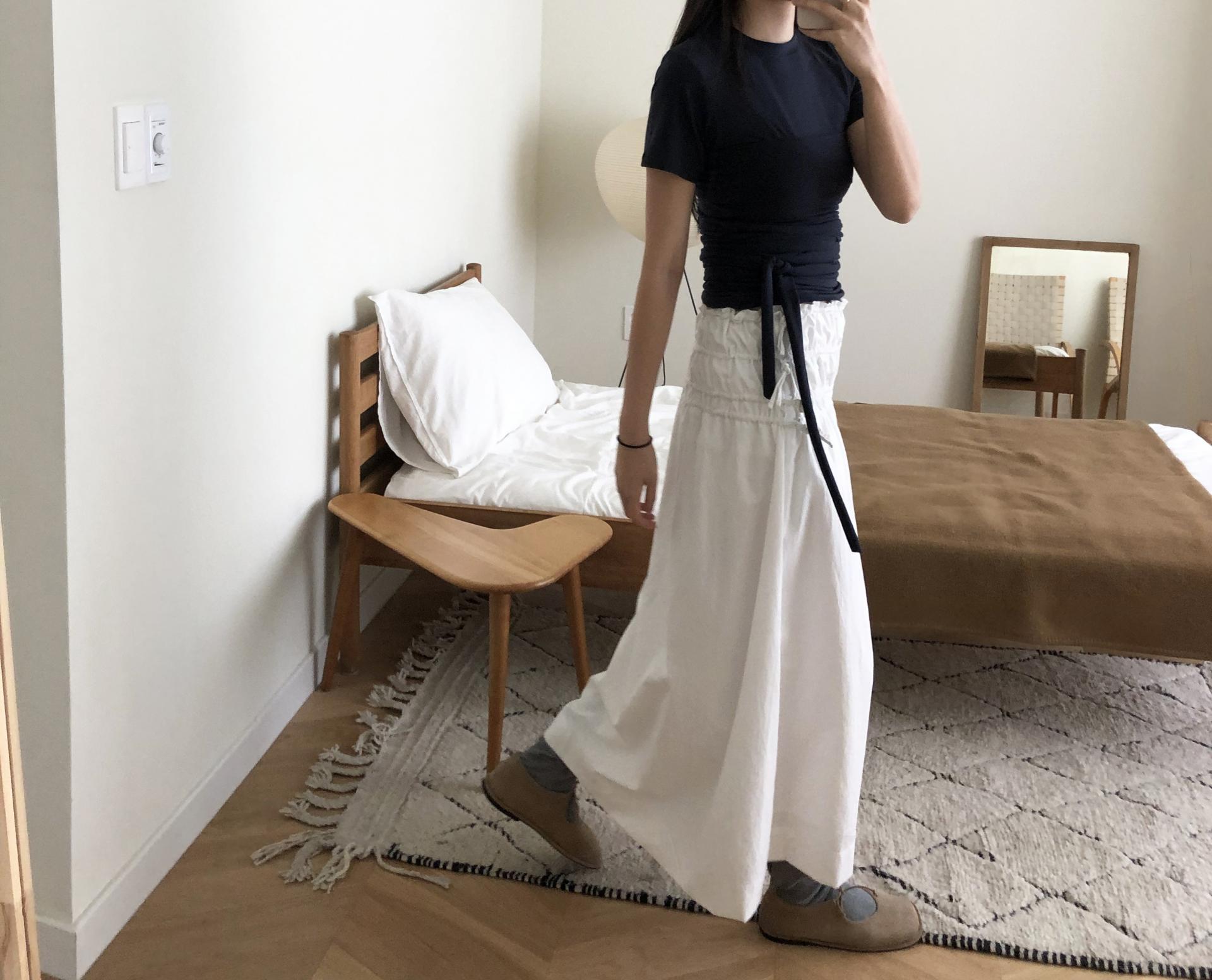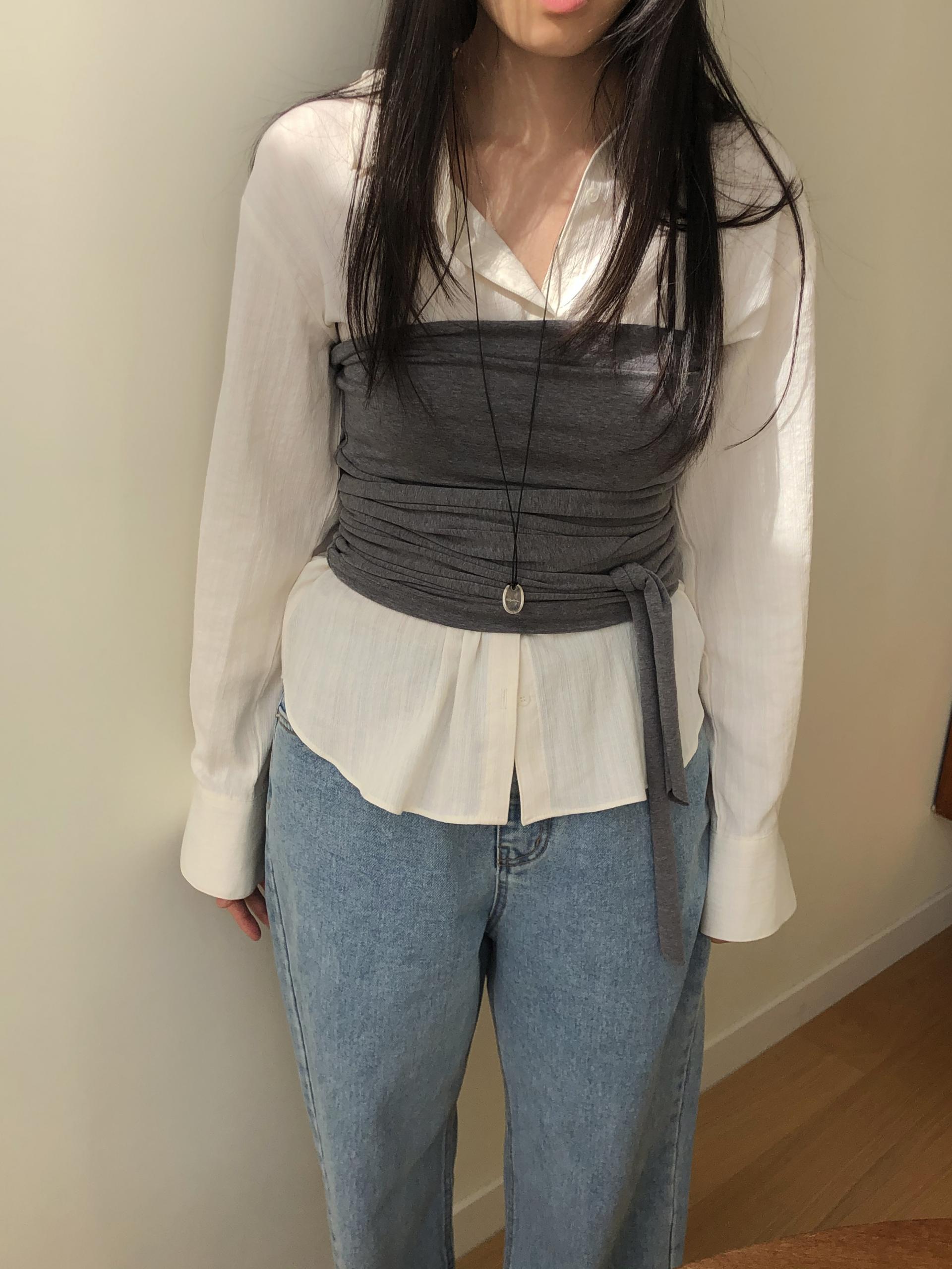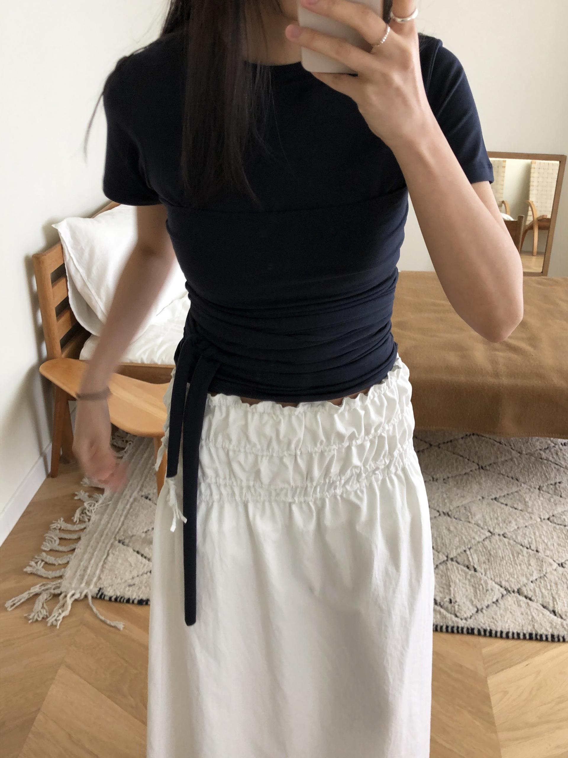 전체적으로 슬림한 핏이지만 신축이 좋아 체형에 크게 구애없이 착용 가능합니다. 튜브탑에 긴 스트랩이 달려있어 취향에 따라 다양하게 연출할 수 있어요. 스트랩을 길게 늘어뜨려 놓을수도 있고, 여러번 감아 짧게 매듭을 지을 수도 있습니다.