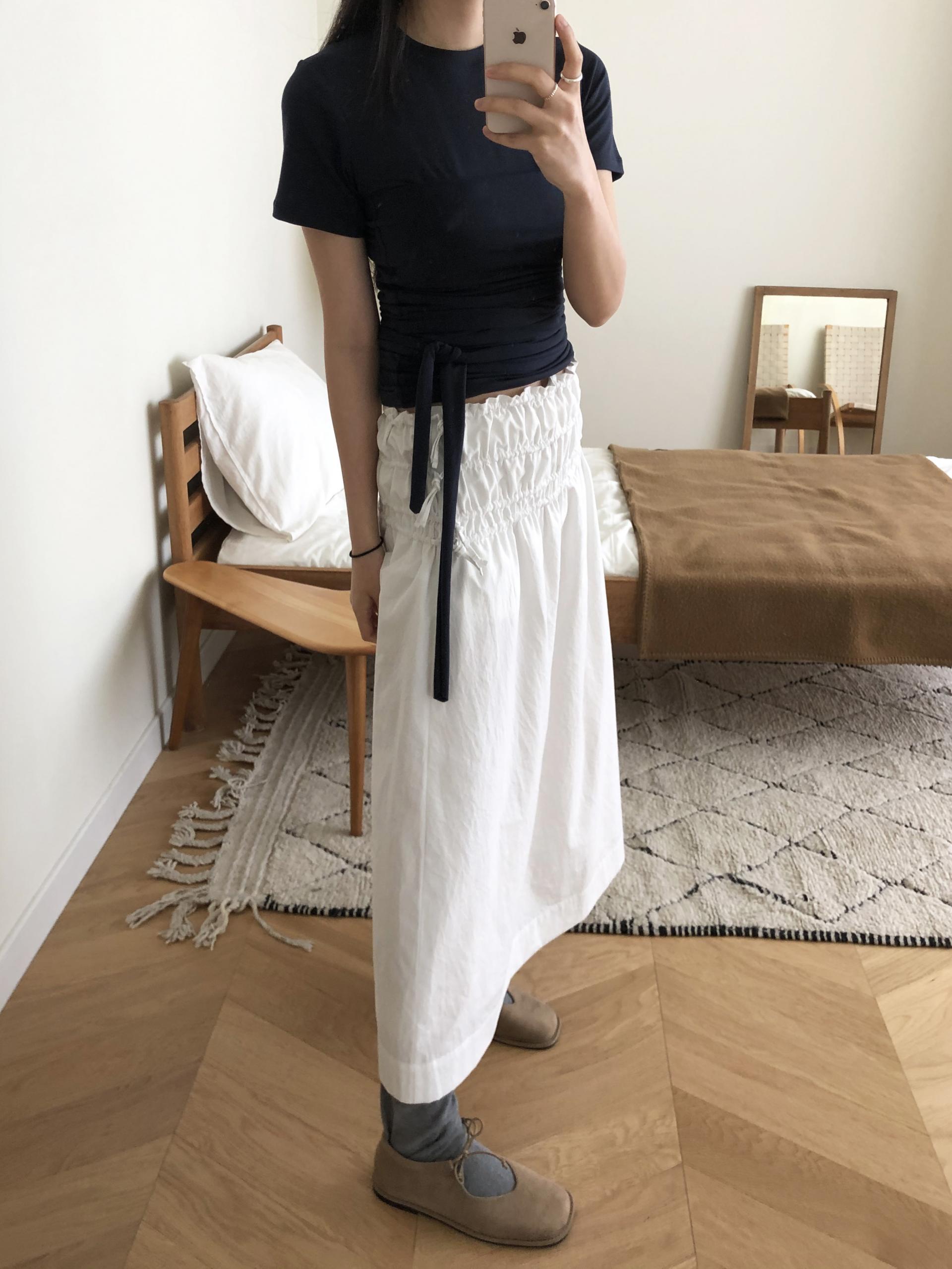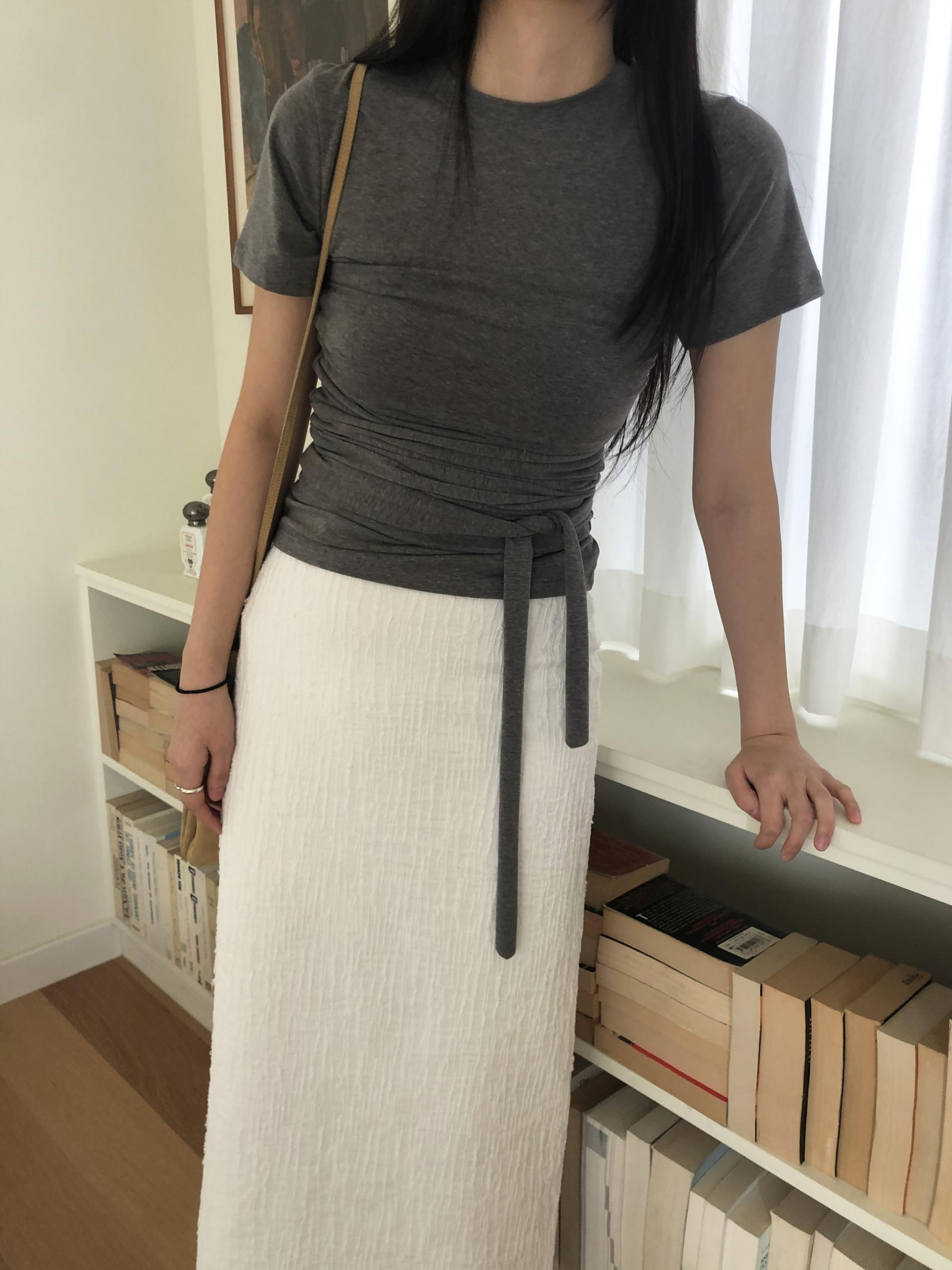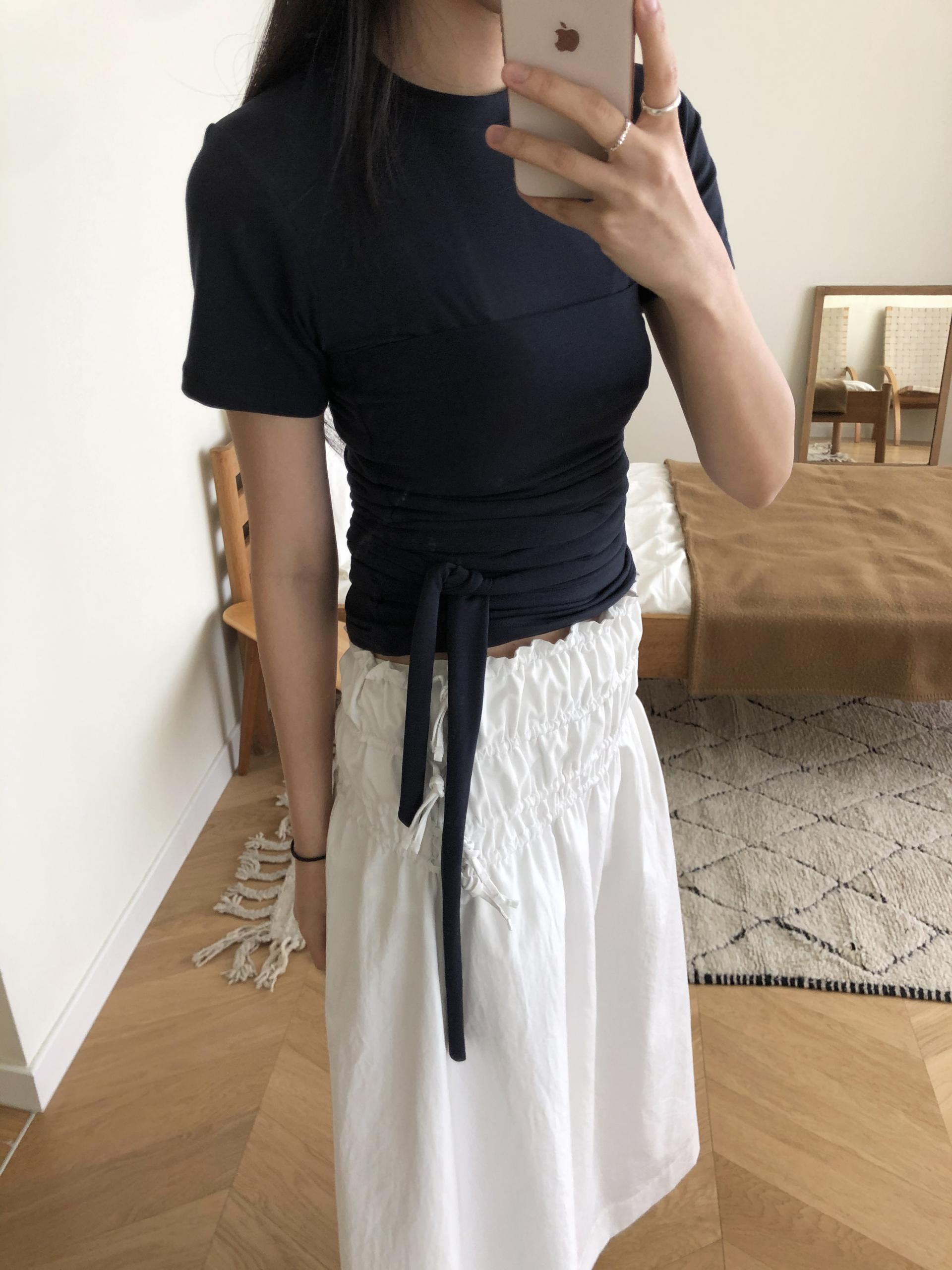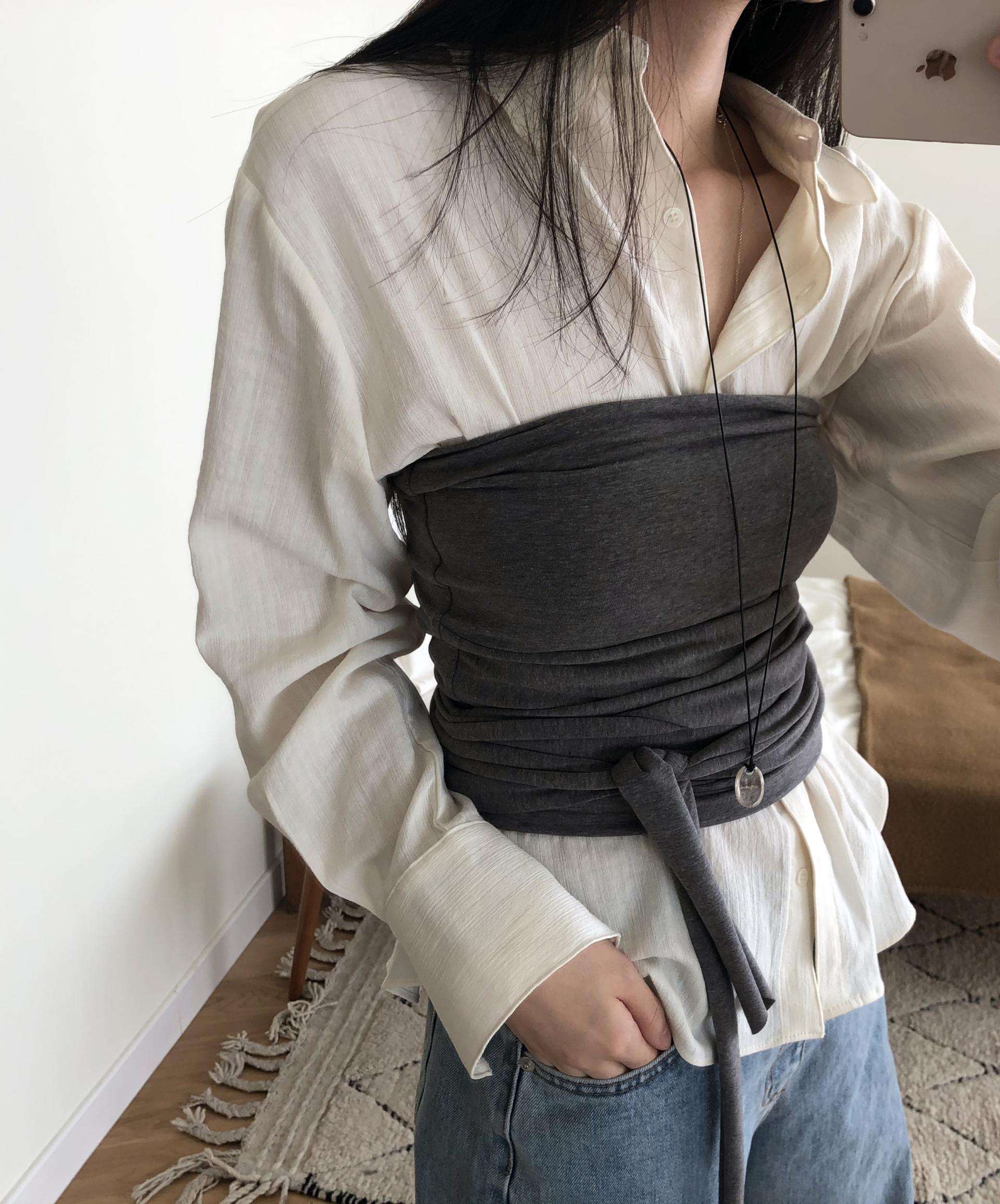 전체적으로 슬림한 핏이지만 신축이 좋아 체형에 크게 구애없이 착용 가능합니다. 튜브탑에 긴 스트랩이 달려있어 취향에 따라 다양하게 연출할 수 있어요. 스트랩을 길게 늘어뜨려 놓을수도 있고, 여러번 감아 짧게 매듭을 지을 수도 있습니다.