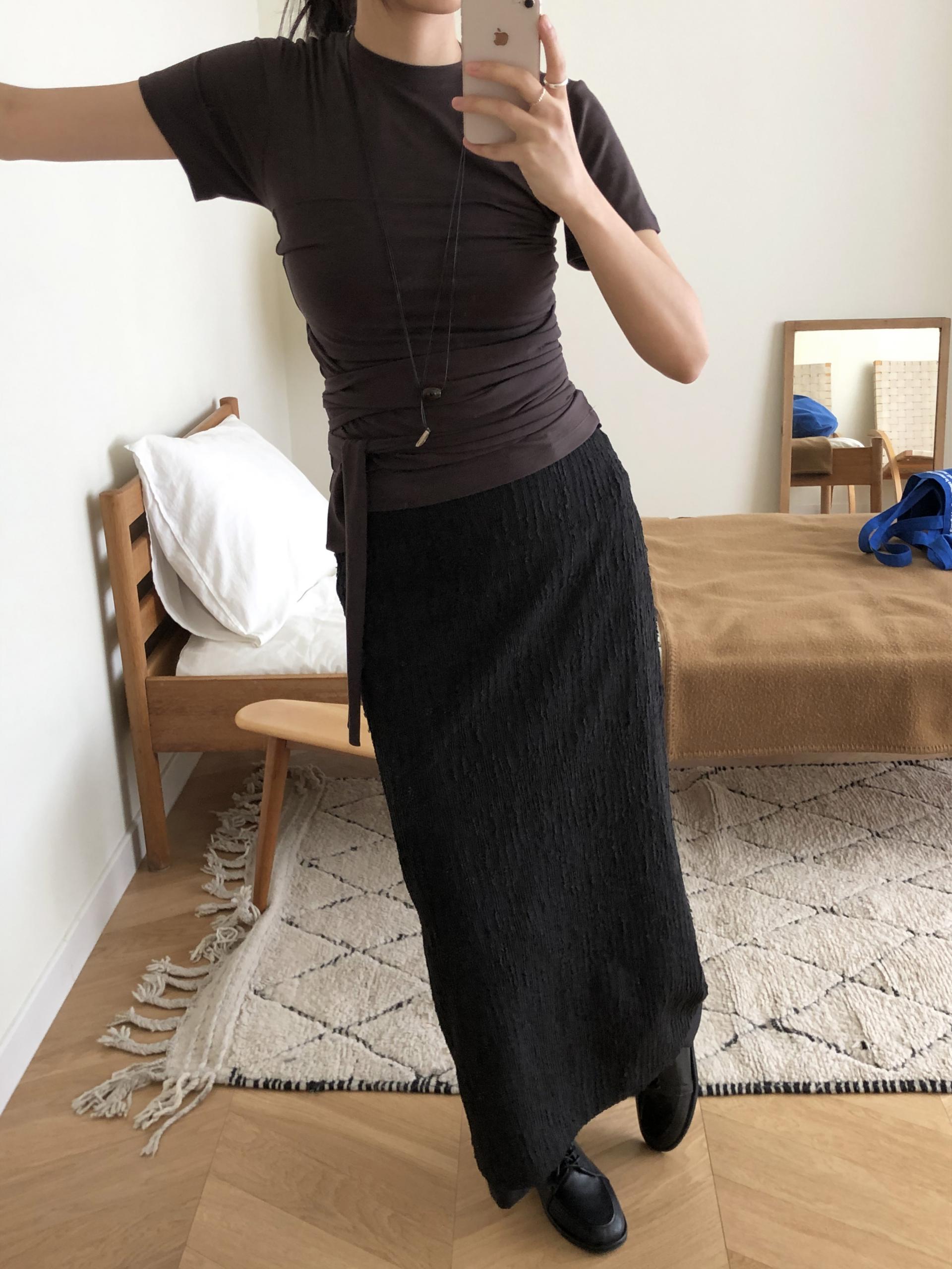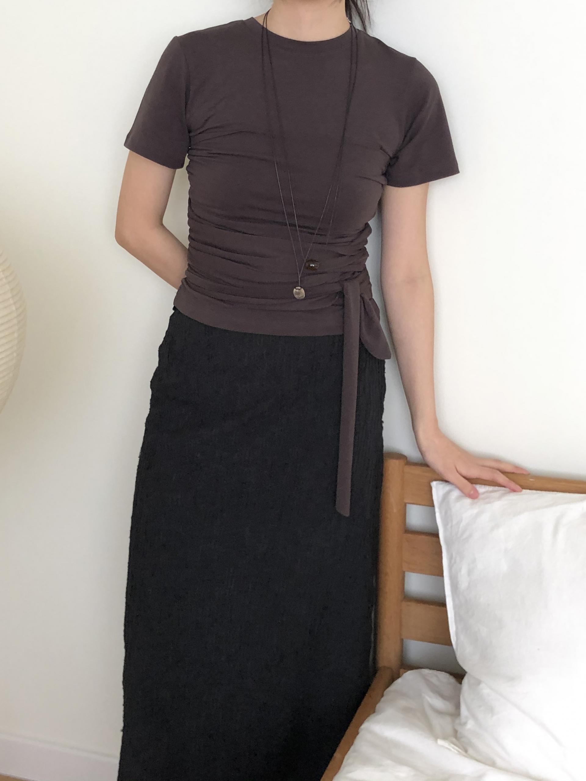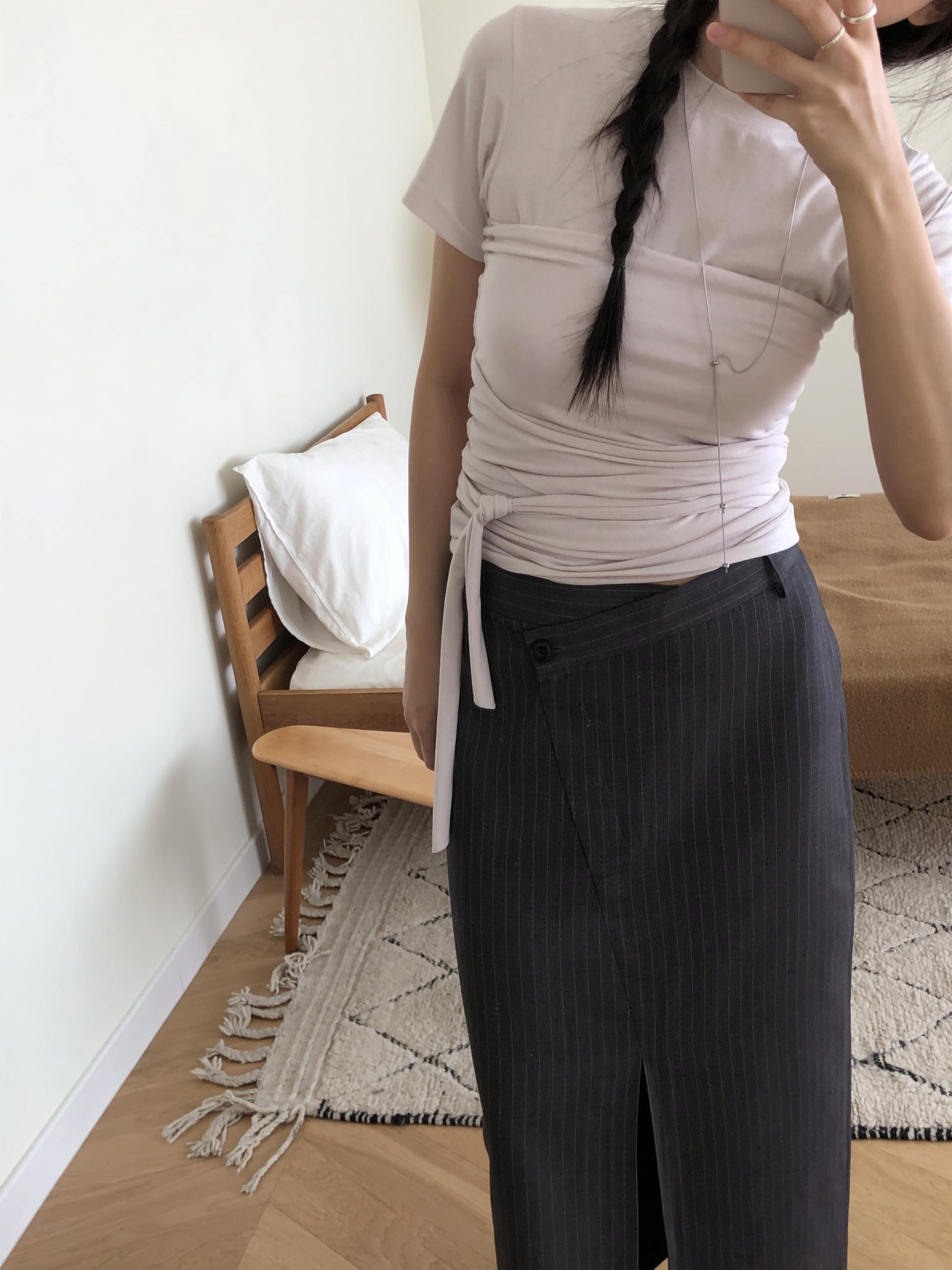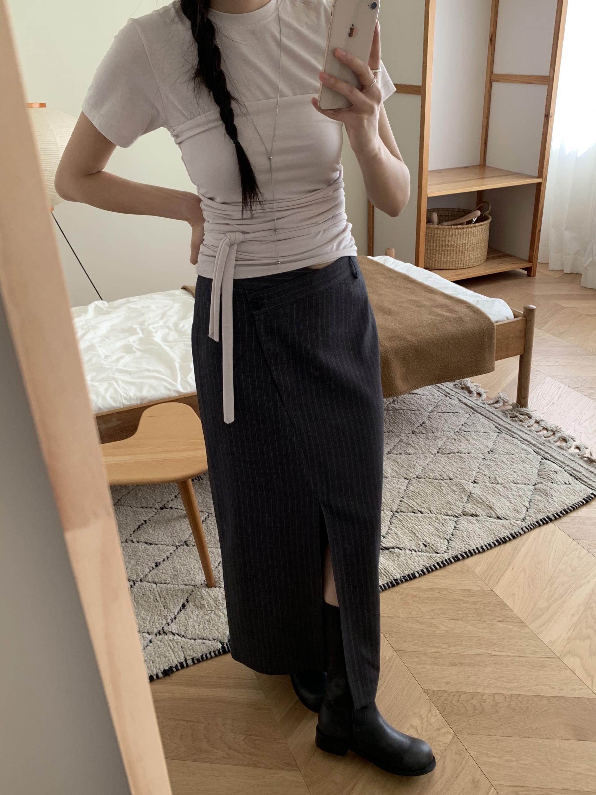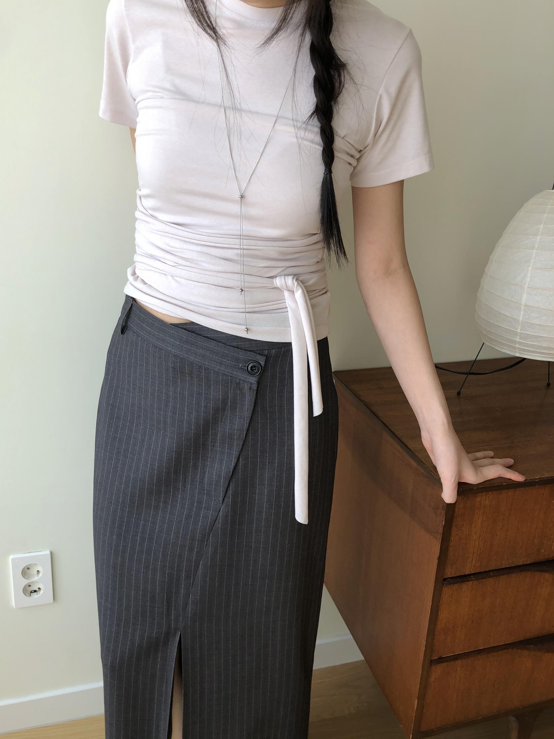 전체적으로 슬림한 핏이지만 신축이 좋아 체형에 크게 구애없이 착용 가능합니다. 튜브탑에 긴 스트랩이 달려있어 취향에 따라 다양하게 연출할 수 있어요. 스트랩을 길게 늘어뜨려 놓을수도 있고, 여러번 감아 짧게 매듭을 지을 수도 있습니다.
