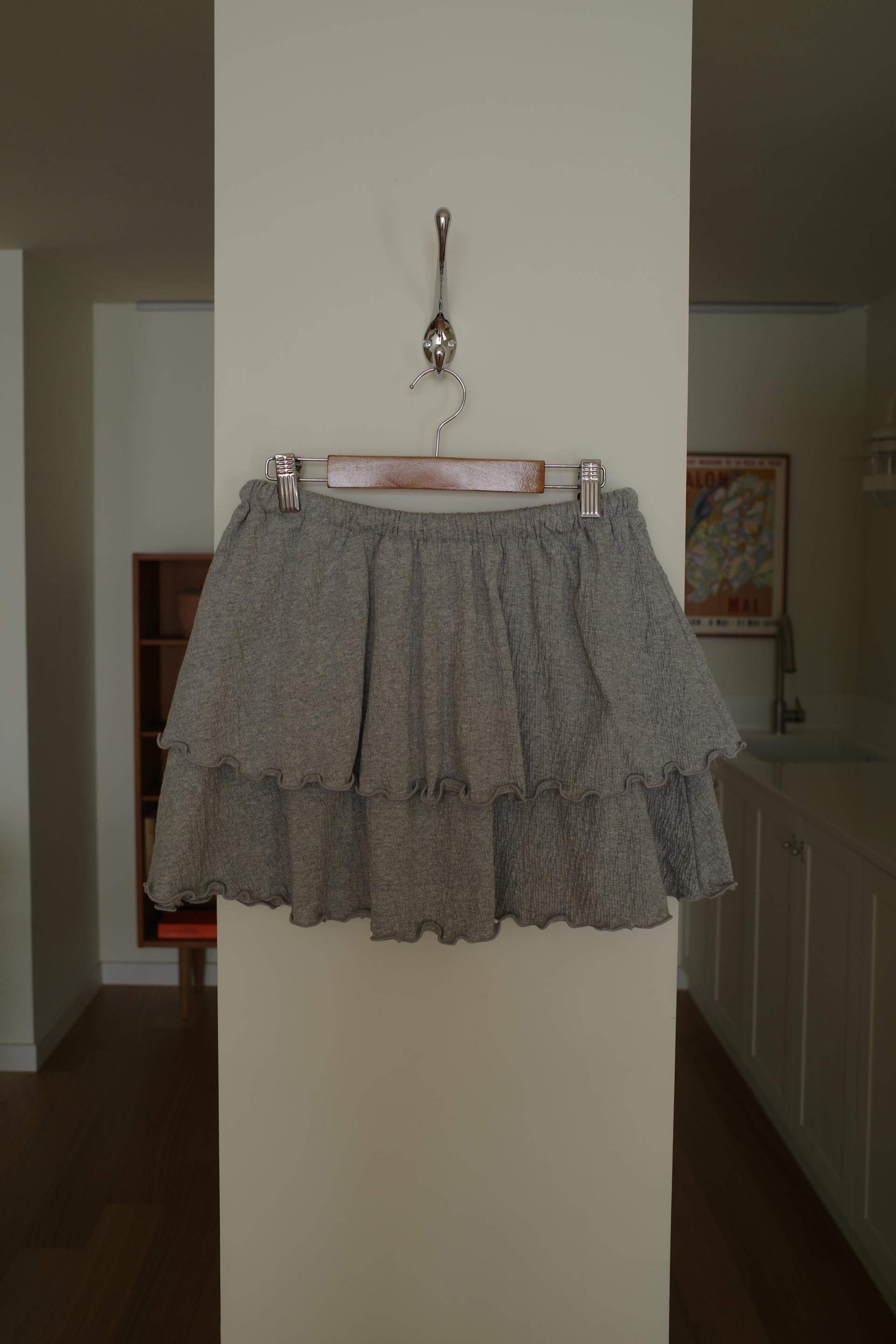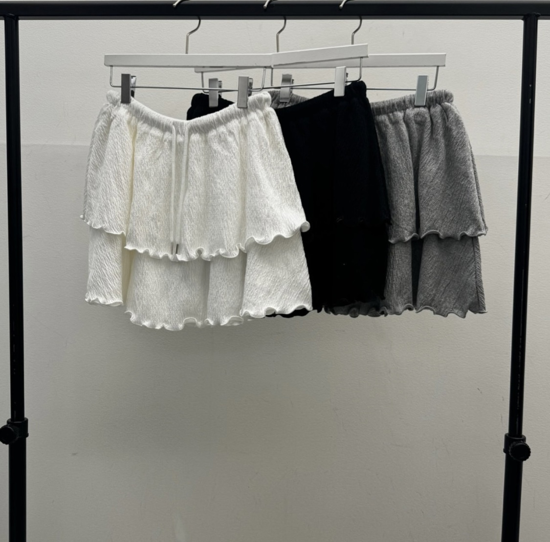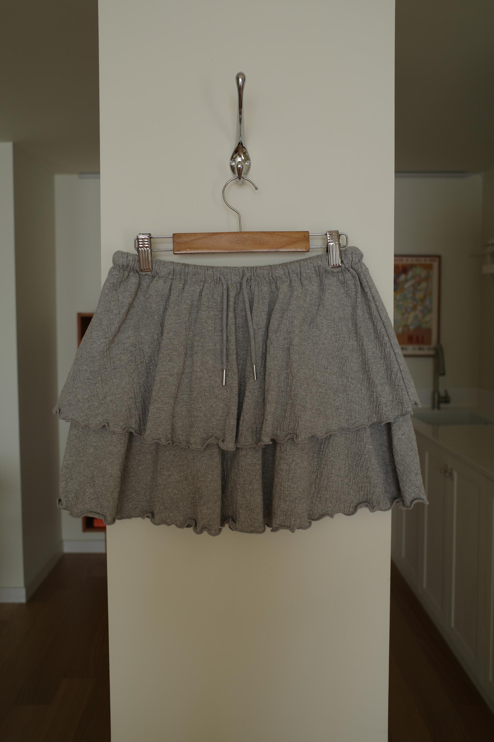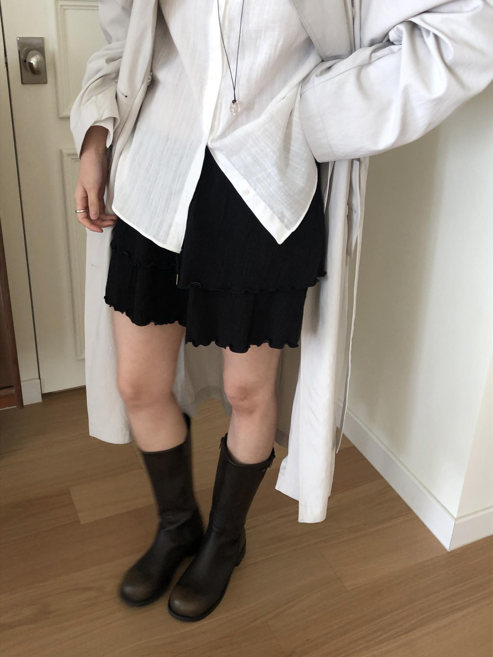 캉캉 디자인의 미니 기장 스커트로 발랄하고 경쾌한 분위기가 두드러집니다. 과하지 않은 2단의 물결 디자인이라 러블리한 무드나 스타일링이 어려운 분들께도 추천드리는 제품입니다.