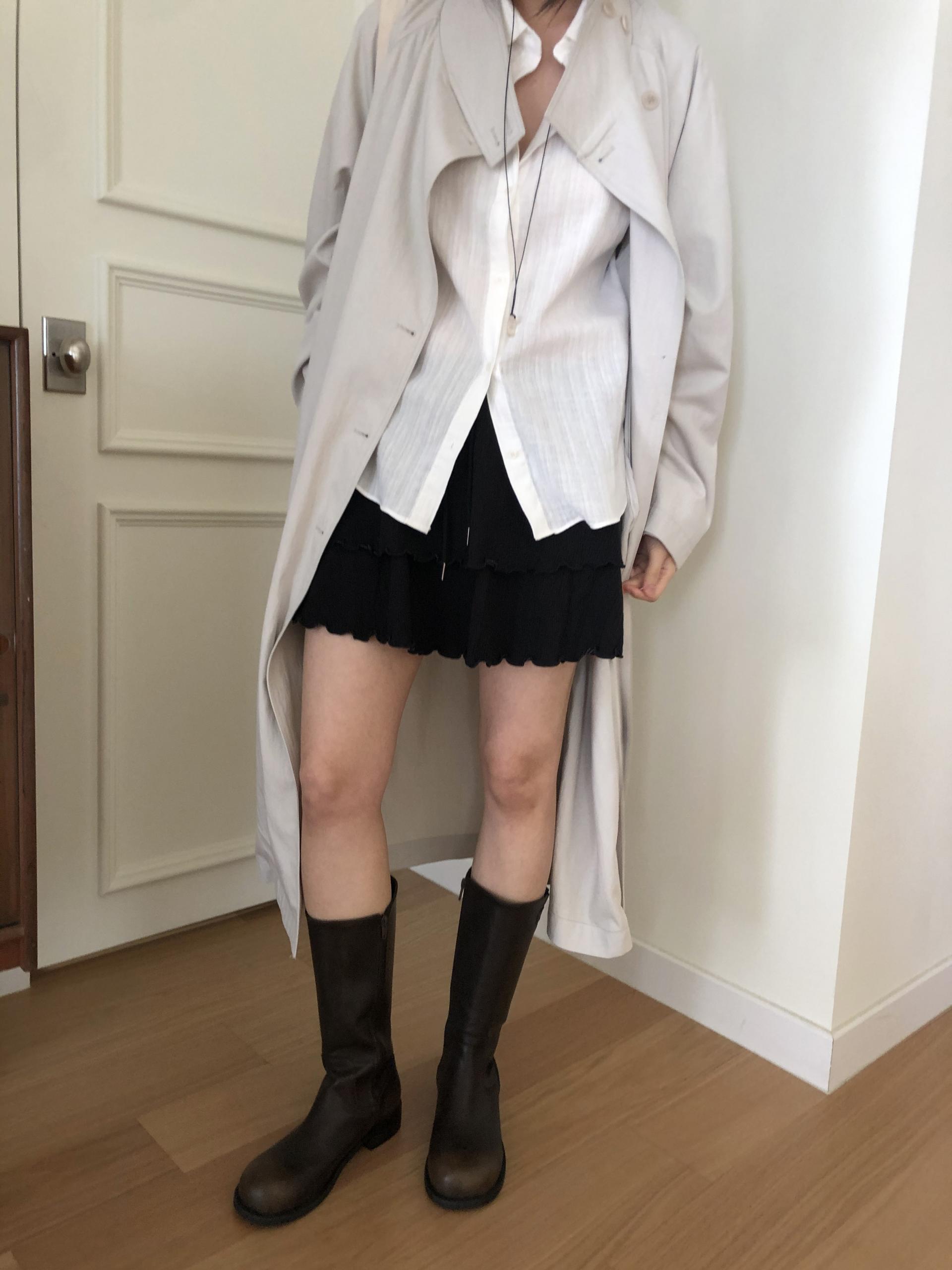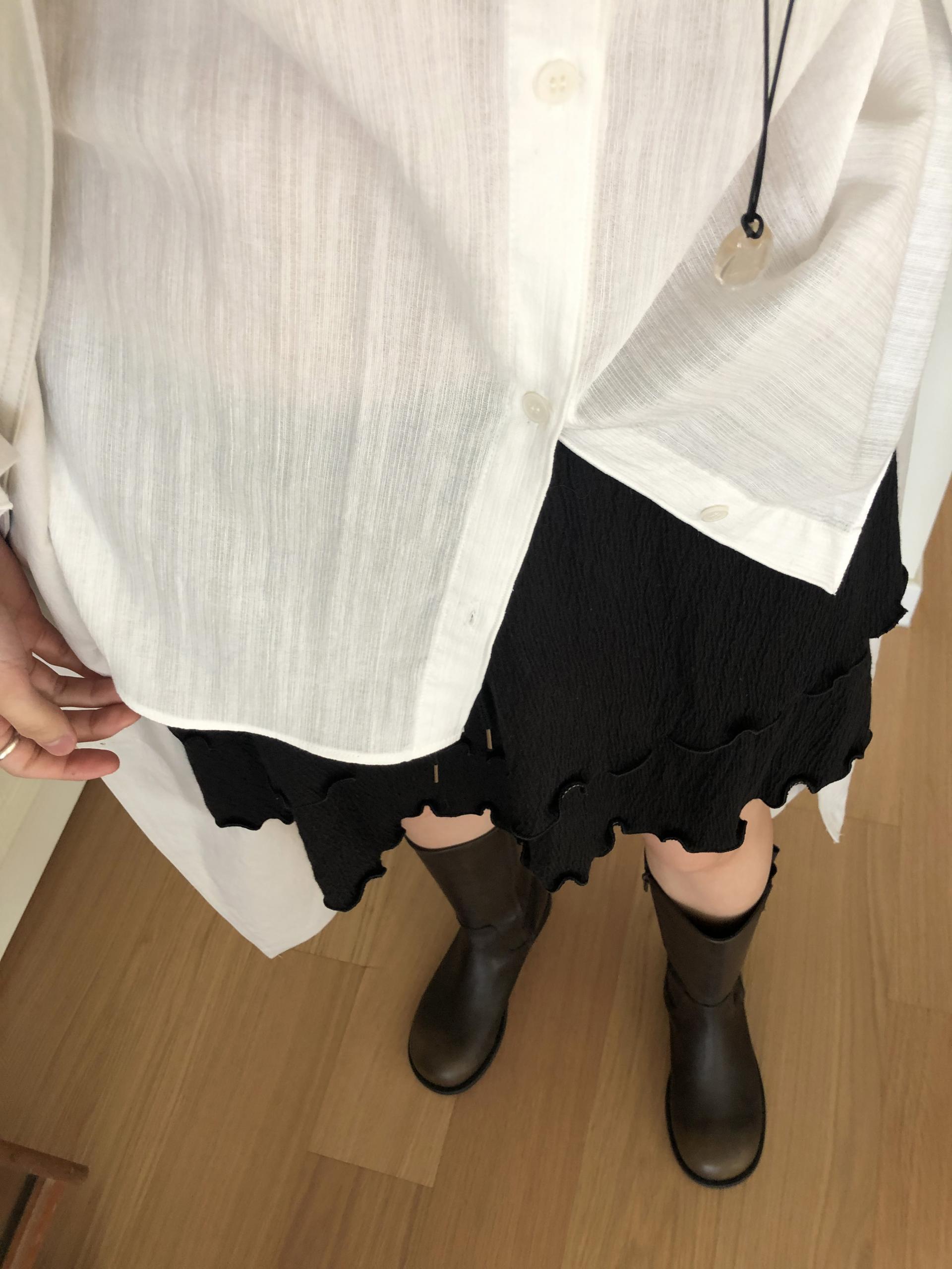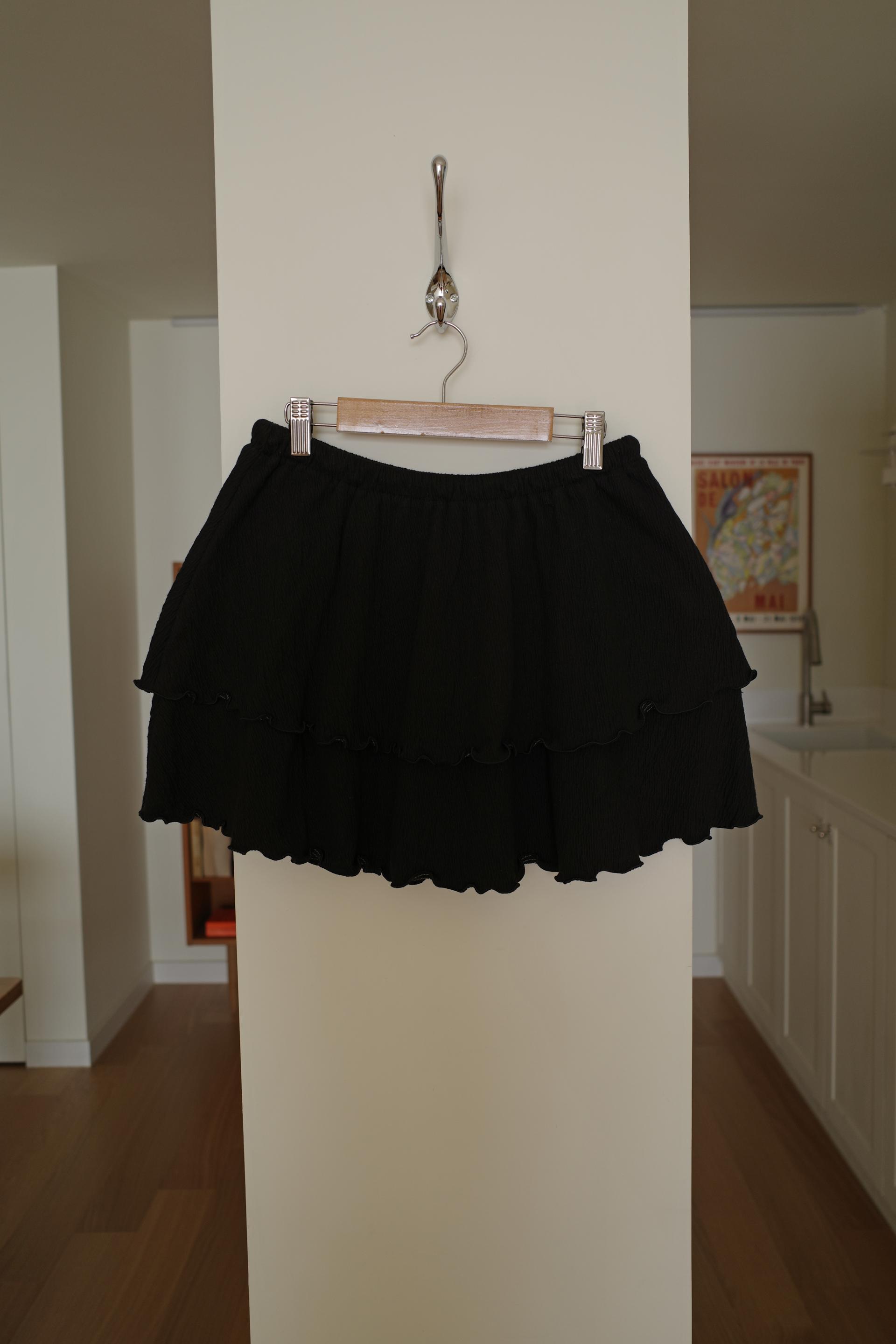 캉캉 디자인의 미니 기장 스커트로 발랄하고 경쾌한 분위기가 두드러집니다. 과하지 않은 2단의 물결 디자인이라 러블리한 무드나 스타일링이 어려운 분들께도 추천드리는 제품입니다.